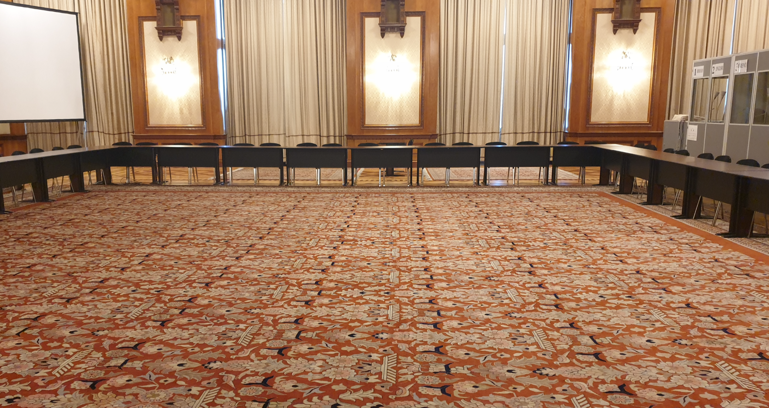 전체 중 95% 이상의 목재는 자국에서 충당했으며, 20만 제곱미터의 양모 카펫와 맞춤식으로 짠 커튼과 금은으로 장식한 벨벳 등으로 장식되어 있고,