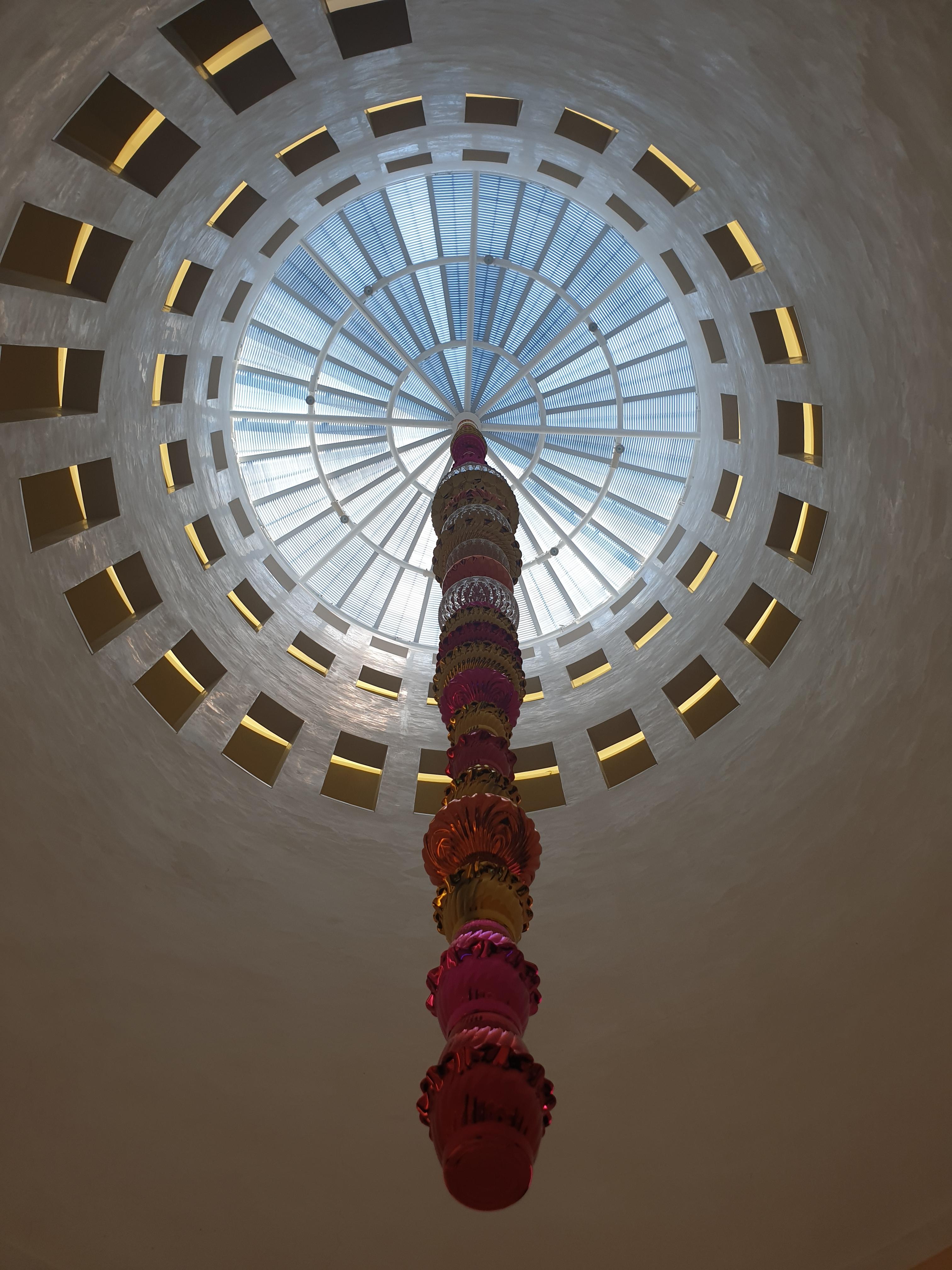 최정화의 <연금술>은 리움 건축의 상징적인 공간인 나선형 계단의 로툰다 천창에 매달려 있습니다. 형형색색의 플라스틱 접시들을 구슬 목걸이처럼 일렬로 꿰어 만든 이 작품은 흰 로툰다를 배경으로 오색빛을 발하며 로툰다의 중심을 채워줍니다. 작품 제목인 연금술이 마법같은 기술을 의미하는 것처럼 작가는 플라스틱 공산품을 하늘에서 내려오는 보석 동아줄 같은 신비로운 모습으로 바꾸는 '일상의 연금술'을 실현시켰습니다. 이는 거대하고 완전한 것 대신 일상적 삶에서 발견할 수 있는 하찮고 소소한 것으로부터 예술의 가치를 찾고자 하는 작가의 예술철학을 반영합니다. 또한 미술관 입구의 세기의 선물은 다양한 양식을 혼성 모방한 가짜 기둥으로 건물의 전면을 장식하고 있습니다.