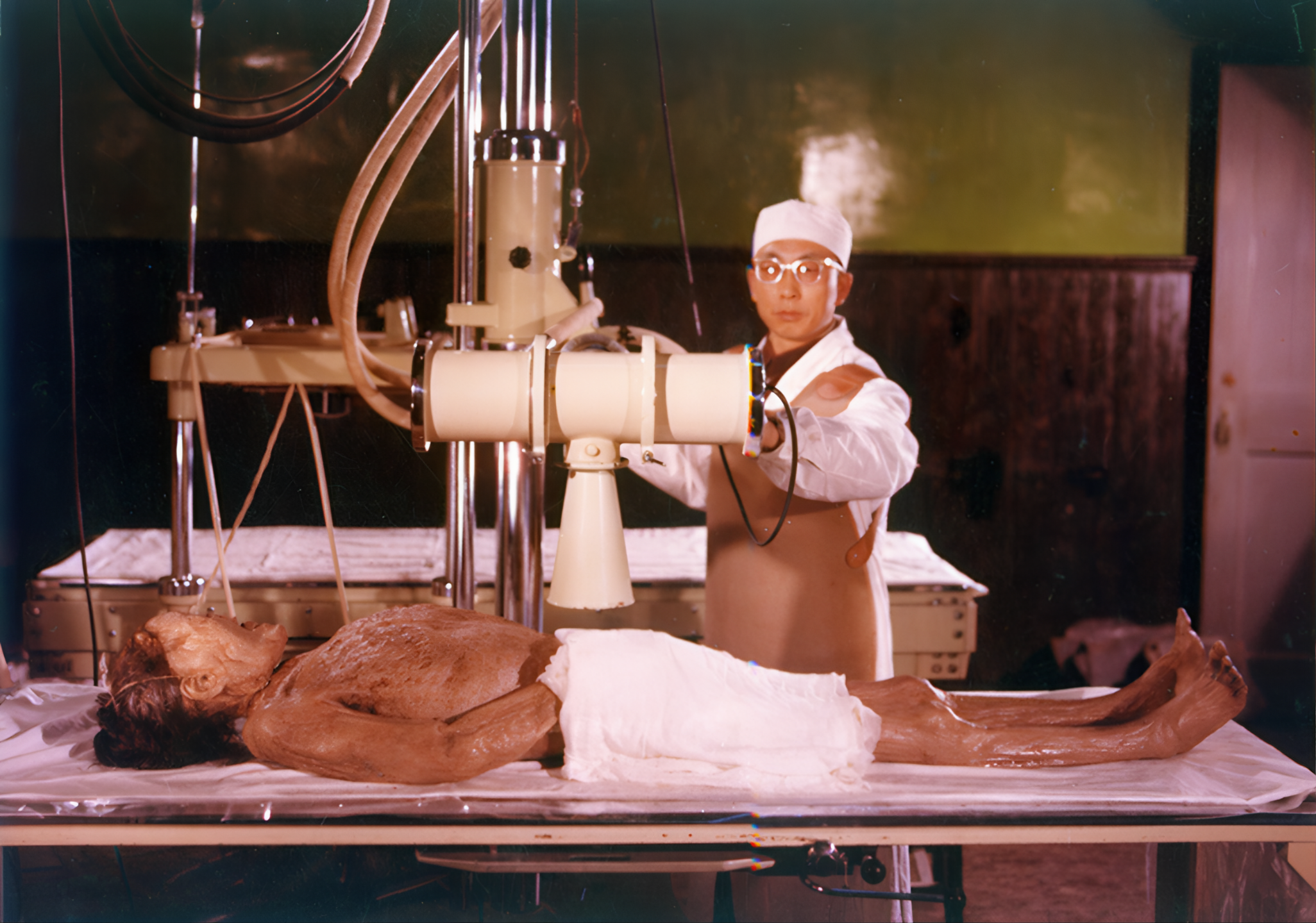 이 사진이 1972년 12월 14일, 호남의학원Hunan Provincial Medical Institute 외과 의사들이 여전히 피부가 촉촉한 신추 유해를 부검하는 장면이다.