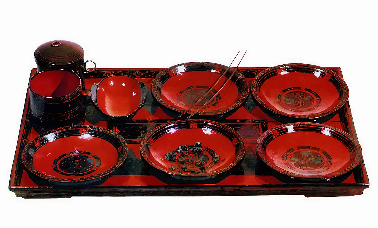 밥상을 저렇게 차리면 비슷한 모양 다섯 개 칠기 그릇에는 요리가 각각 담겨 있었을까.