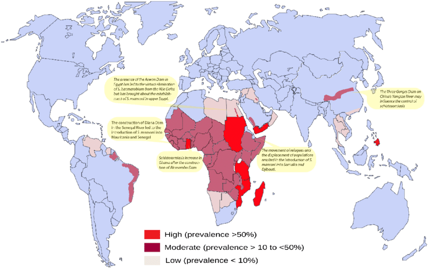 위지도에서 빨갛게 표시된 부분이 주혈흡충이 많은 지역이다.