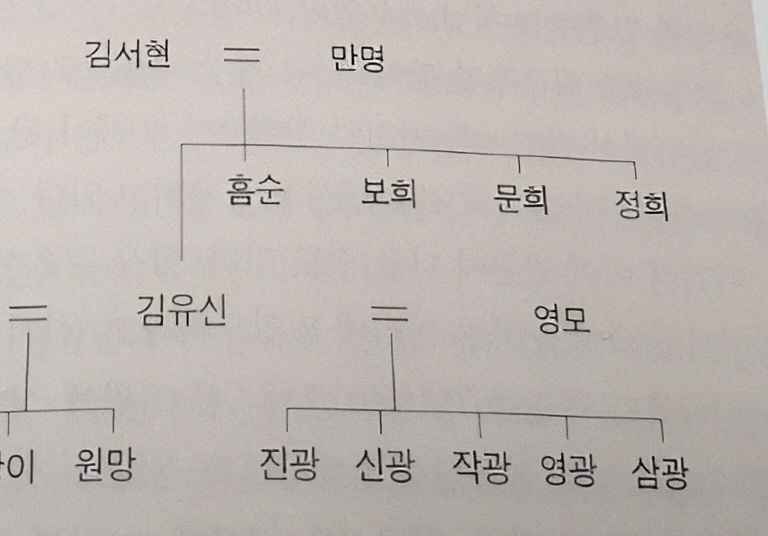 그 네 딸 이름을 진광晉光 신광信光 작광酌光 선광善光이라 해서 첫 부인 령모令母. 소생이라 밝힌다. 이들은 기존에 알려진 김유신 장남 삼광三光과 더불어 모조리 光을 돌림자로 썼다.