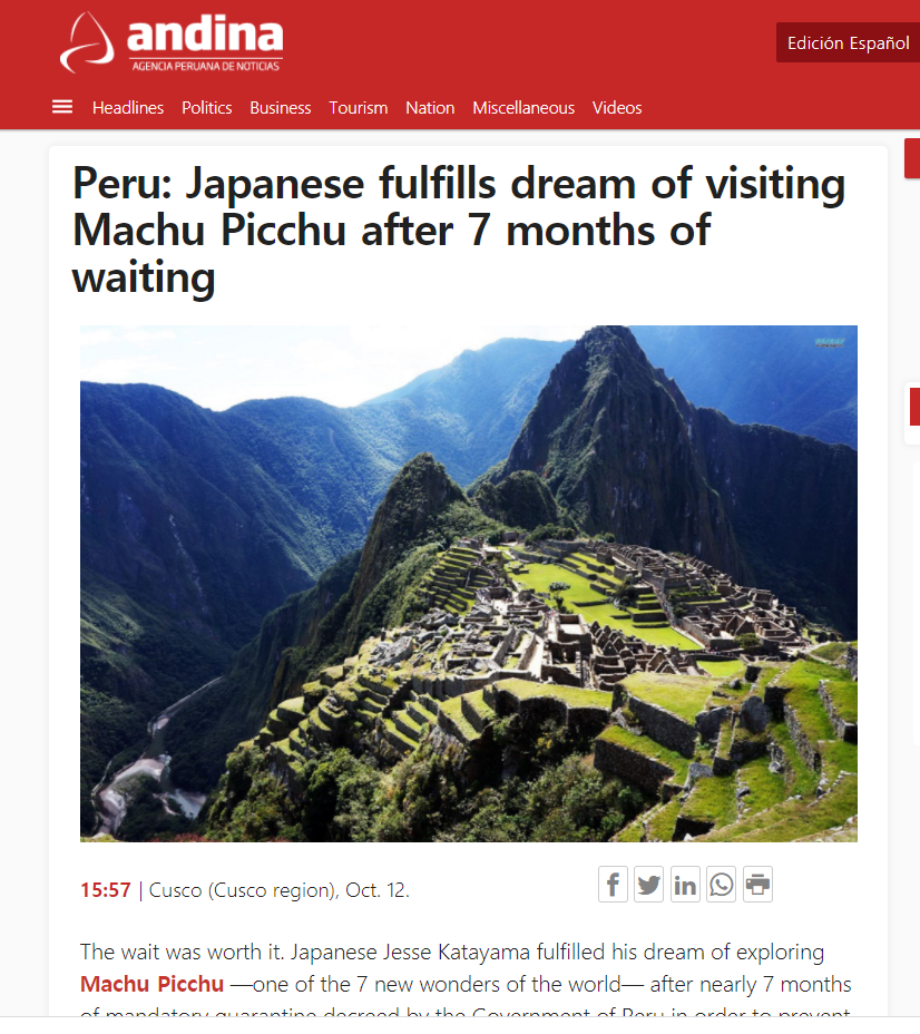 마추픽추 보려고 페루서 7개월 버틴 일본인, 마침내 '단독 관람', 고미혜기자, 국제뉴스 (송고시간 2020-10-13 04:51)