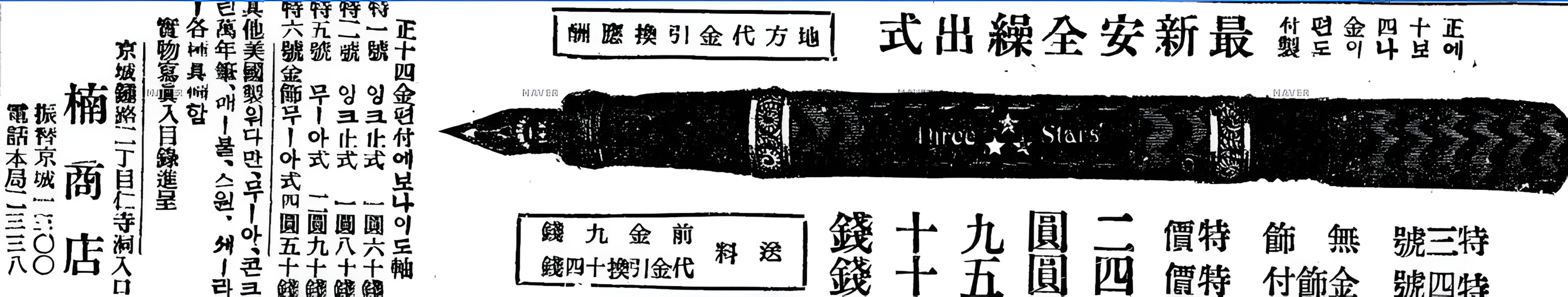 이 광고에 등장하는 "쓰리쓰타" 표 만년필도