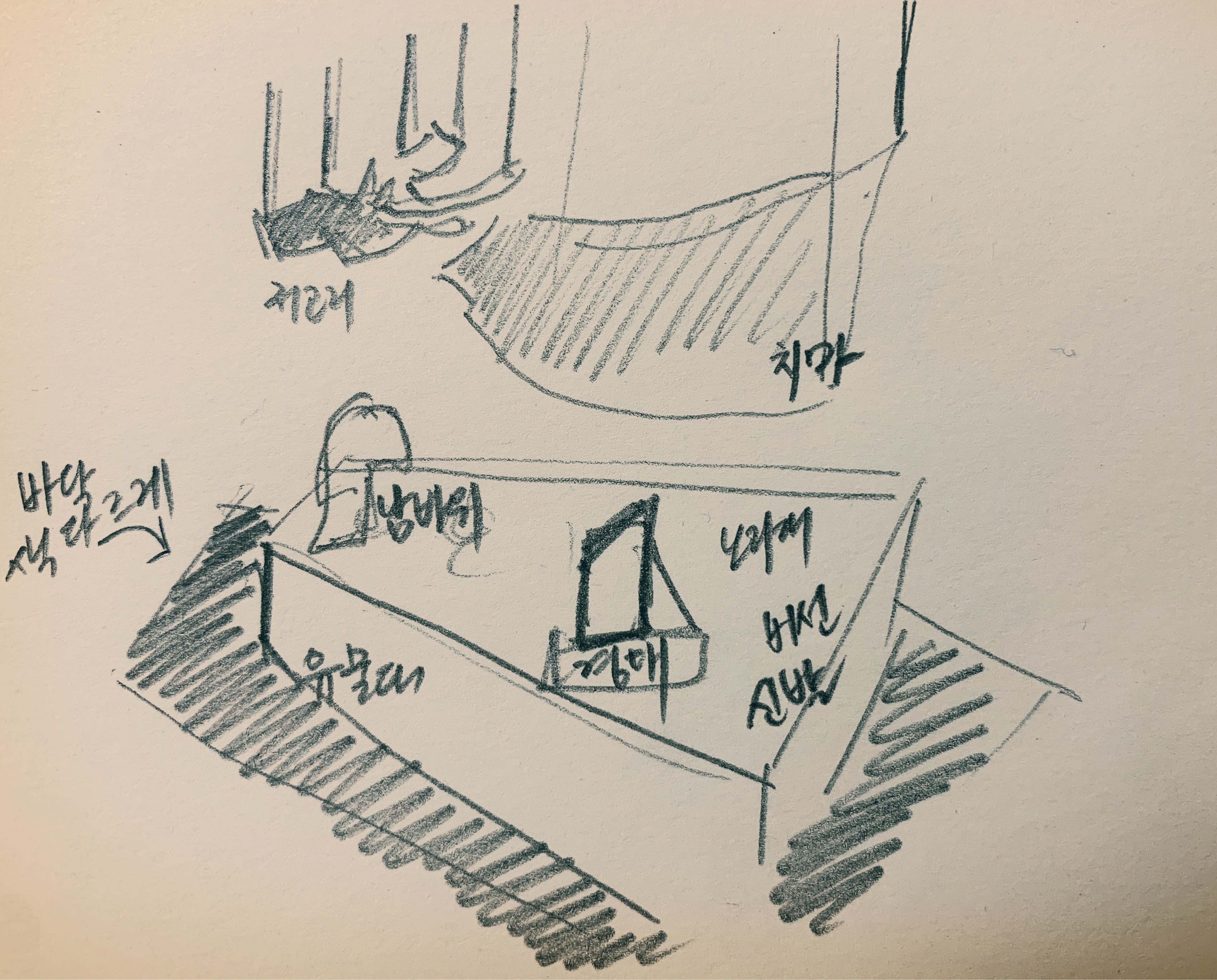 나 : 그 드라마나 영화에 보면 예쁜 규수가 하늘하늘한 염색 천 사이로 보일랑 말랑 지나가는 장면들 많이 나오잖아요. 그렇게 전시실의 한 공간은 천들이 길게 늘어 뜰여져있으면 좋을 것 같아요.