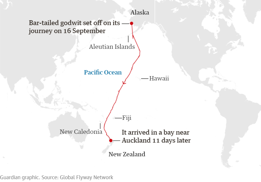 Bar-tailed godwit flies more than 12,000km from Alaska to New Zealand in 11 days