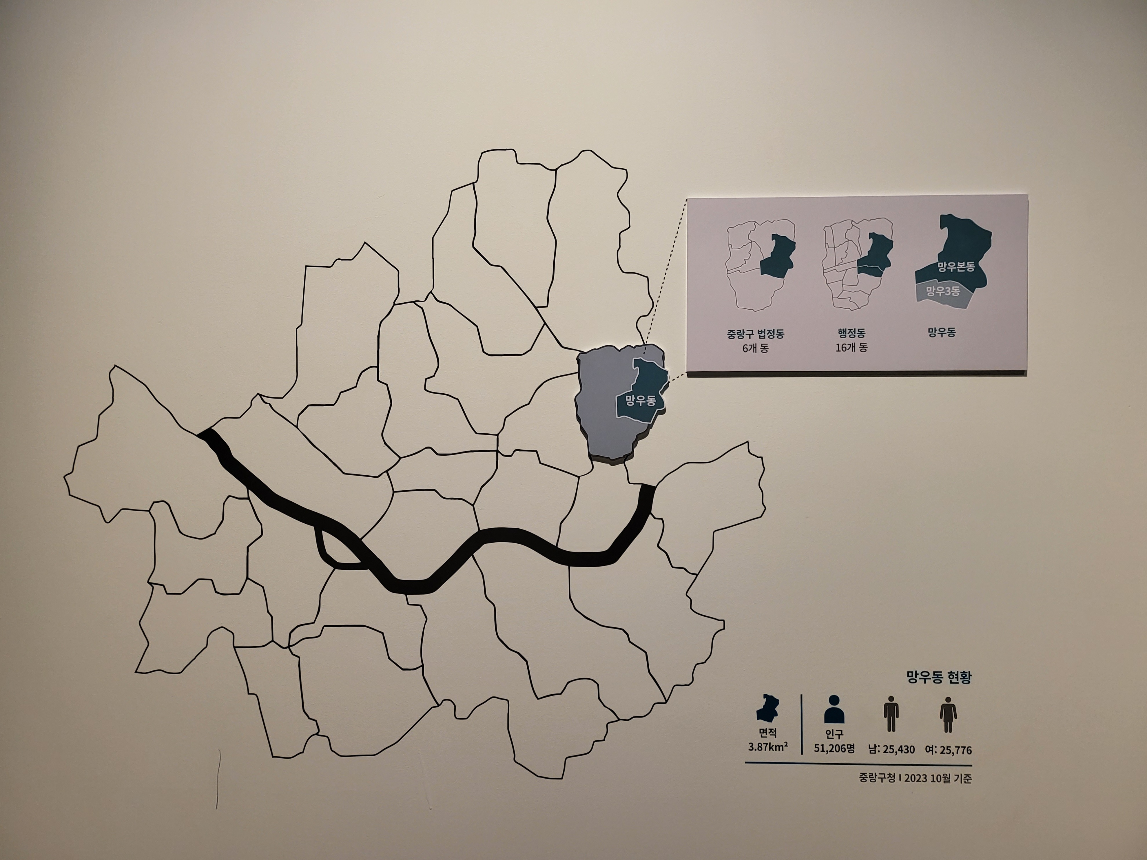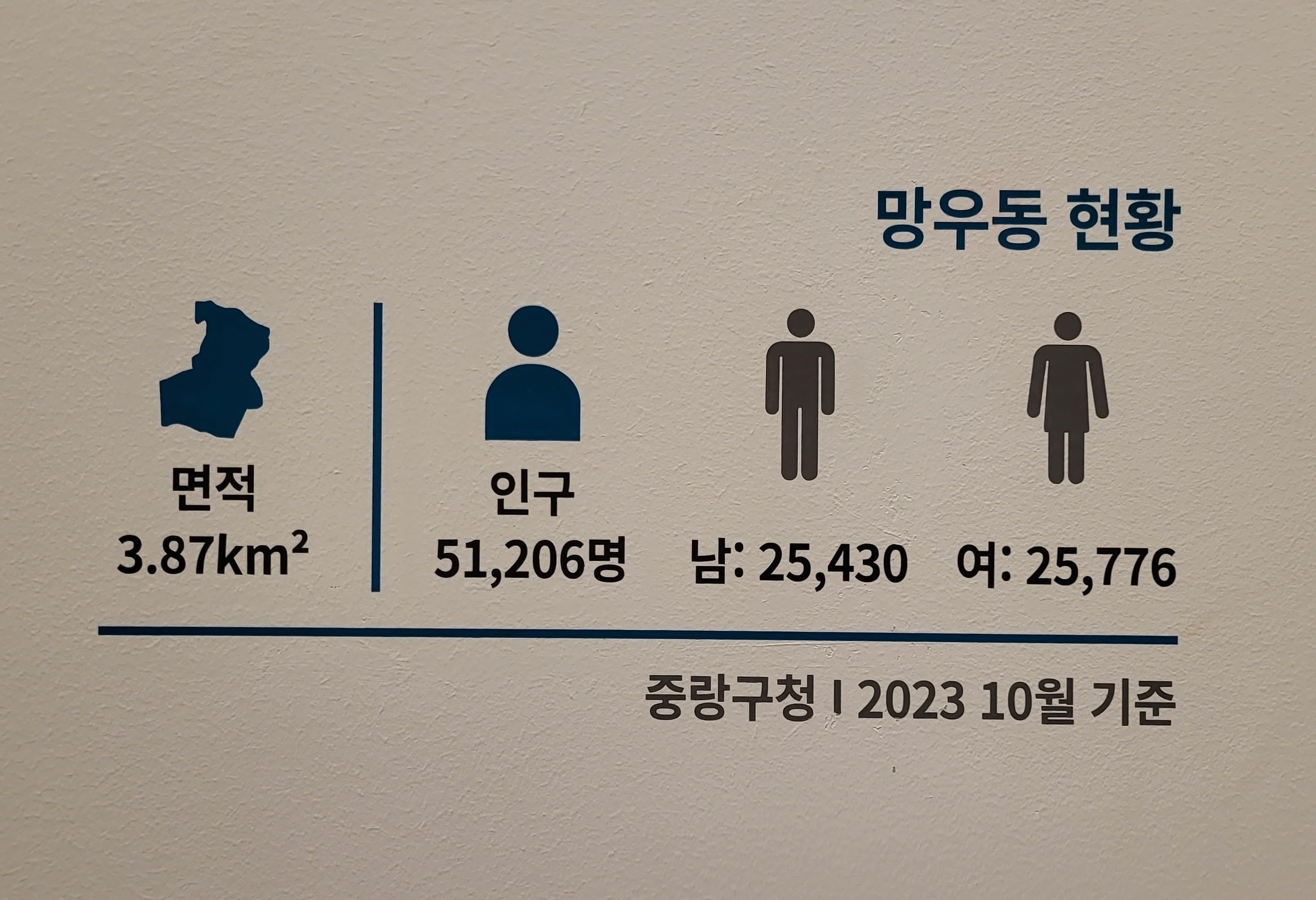 중랑구를 구성하는 행정동 중 하나인 망우동 올 연말 현재 주민등록상 인구는 대략 오만천명이라 빠글빠글하다.