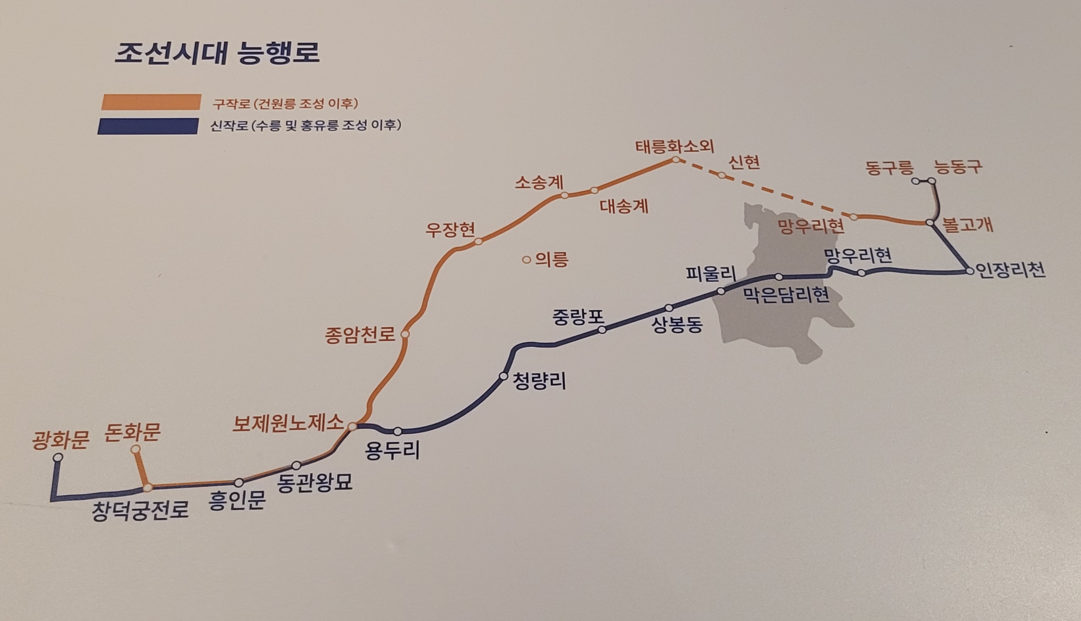 능행로는 조선의 왕이 조상의 제사를 지내기 위해 오간 길을 말한다. 망우동은 능행로 중간에 있었다.