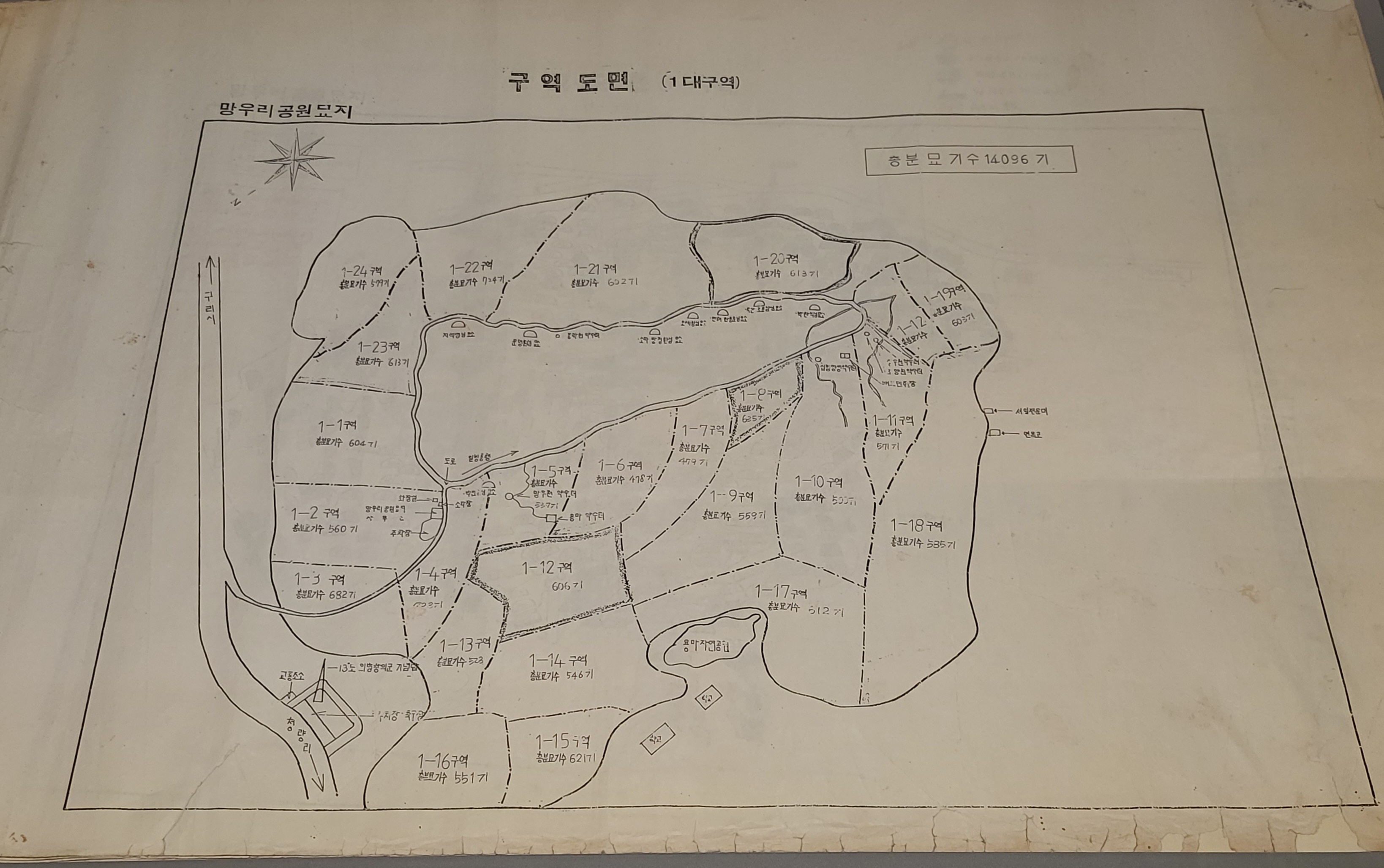 1990년대 분묘 도면이다. 망우리공원묘지 관리를 위해 여러 구역을 설정하여 분묘의 위치와 숫자를 표기한 도면이다.
