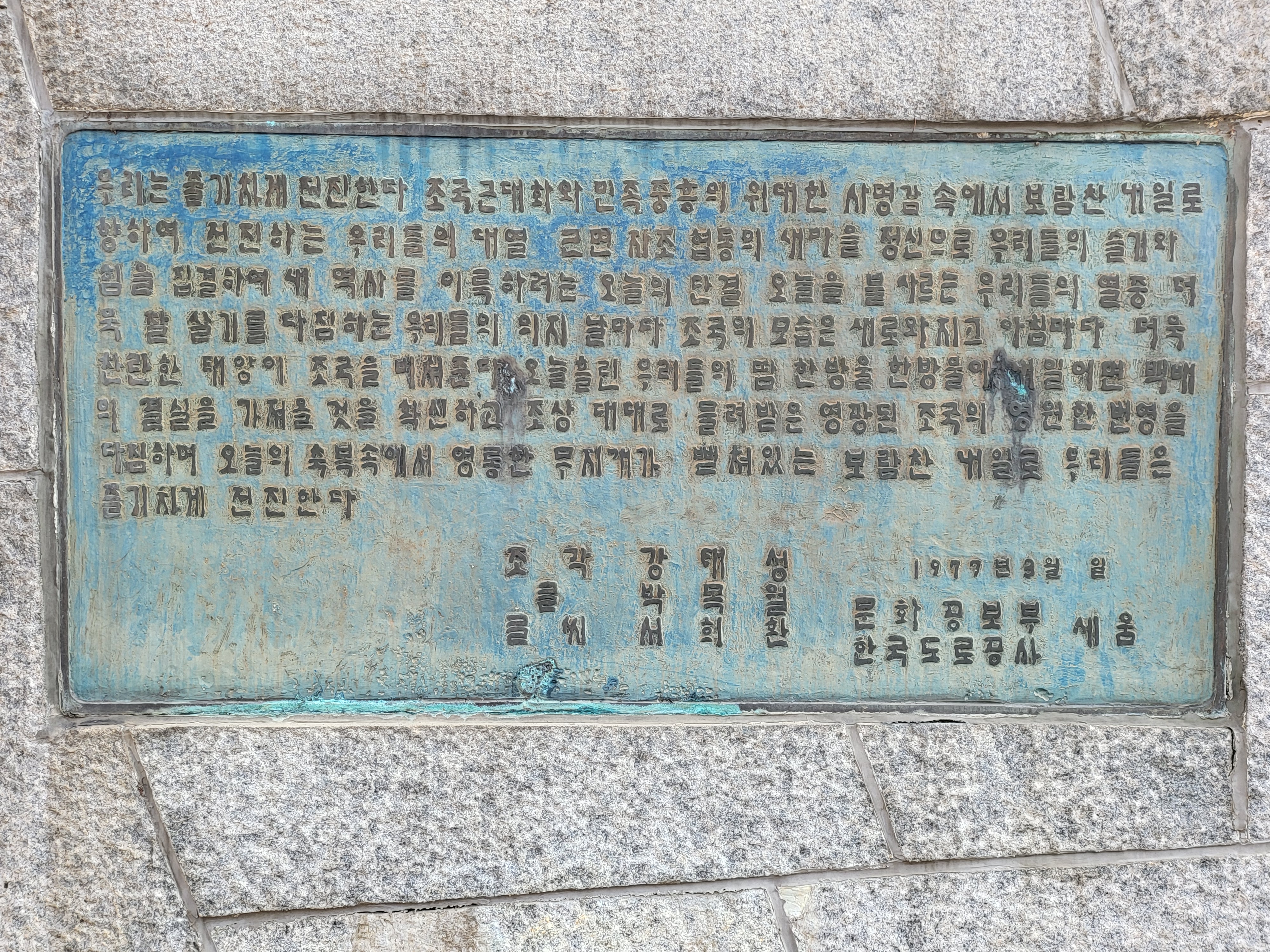 오늘 흘린 우리들의 땀 한 방울이 내일이면 -백배의 결실을 가져올 것을 확신하고 조상 대대로 물려받은 영광된 조국의 영원한 번영을 다짐하며 오늘의 축복속에서 영롱한 무지개가 뻗쳐있는 보람찬 내일로 우리들은 줄기차게 전진한다.