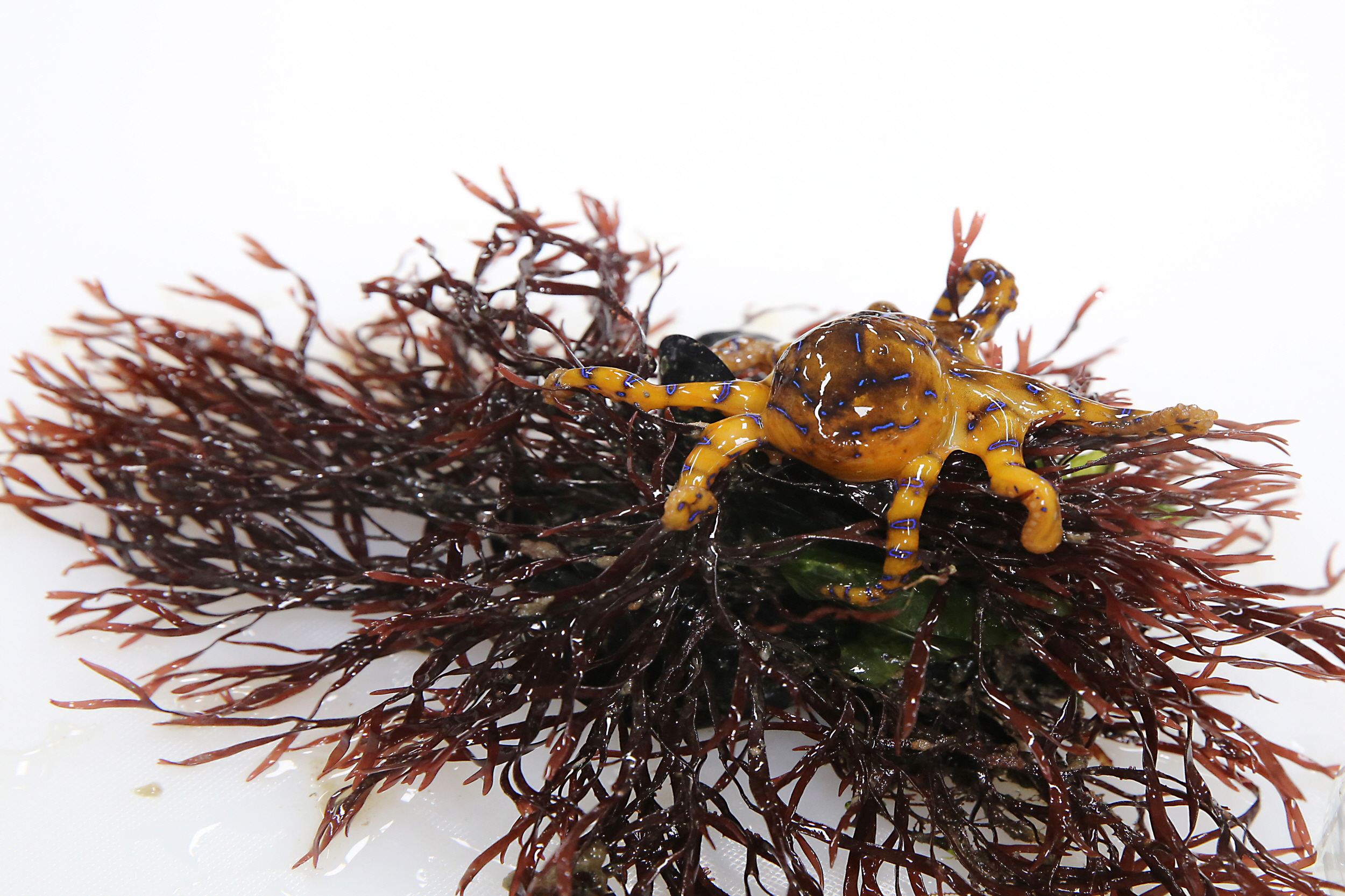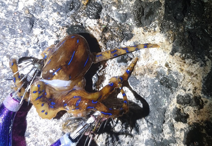 (제주=연합뉴스) 백나용 기자 = 제주 해상에서 청산가리 10배 이상의 맹독을 지난 파란선문어가 발견됐다.10일 제주해양경찰서에 따르면 전날 오후 9시 17분께 제주시 조천읍 신촌포구에서 낚시를
