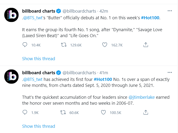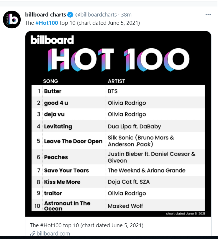 그런 방탄이가 지난해 8월 첫 영어곡 '다이너마이트'로 1등을 먹은 힘을 바탕으로 같은해 11월에는 "Life Goes On"이라는 한국어 기반 노래도 1등으로 밀어올렸다. 그런 그들이 이번에 1등에 세번째로 오른 Butter는 다이너마이트에 이은 두번째 싱글 1등 먹은 영어노래다.