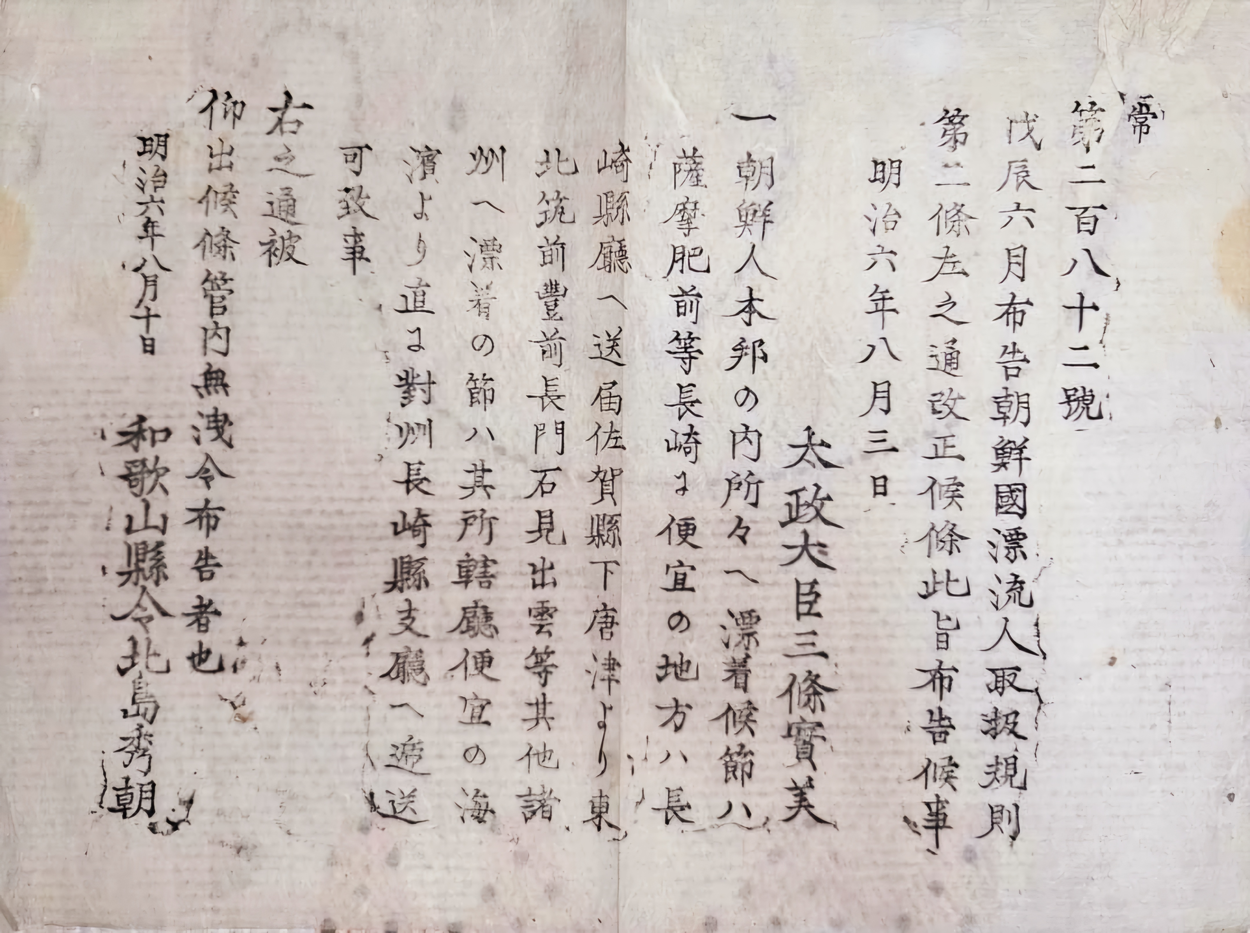 이로부터 5년 전인 1868년 6월, 에도 바쿠후를 무너뜨리고 들어선 일본 신정부가 포고한 <조선국표류인취급규칙朝鮮國漂流人取扱規則>의 2조를 개정하였다는 사실을 알리는 내용인데, 그렇게 개정된 내용이 무엇이냐?