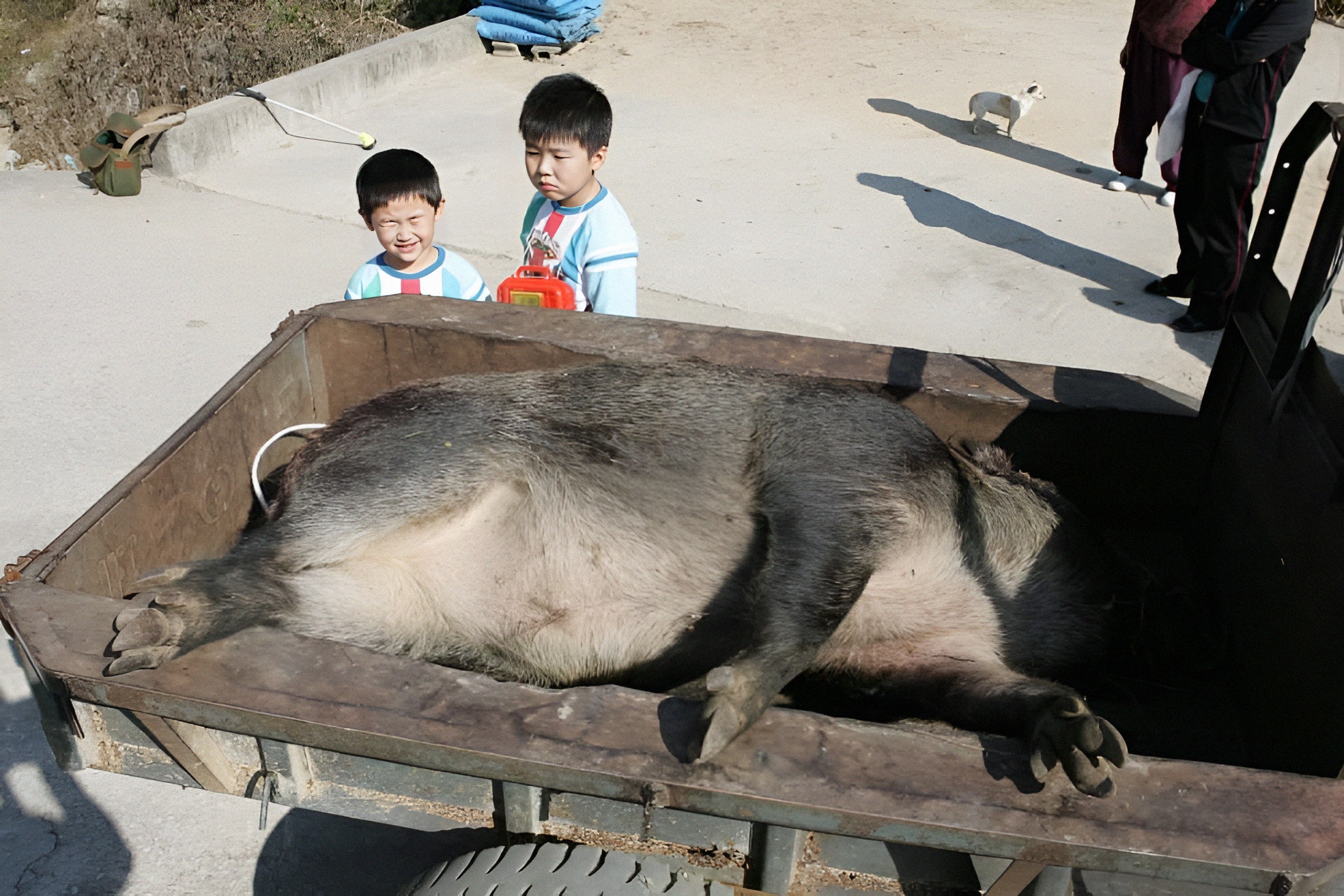 가을빛이 깊어가던 2007년 11월 2일 경북 김천시 대덕면 조룡1리 샛터 뒷산에 전문 사냥꾼들이 때려잡은 멧돼지다.
