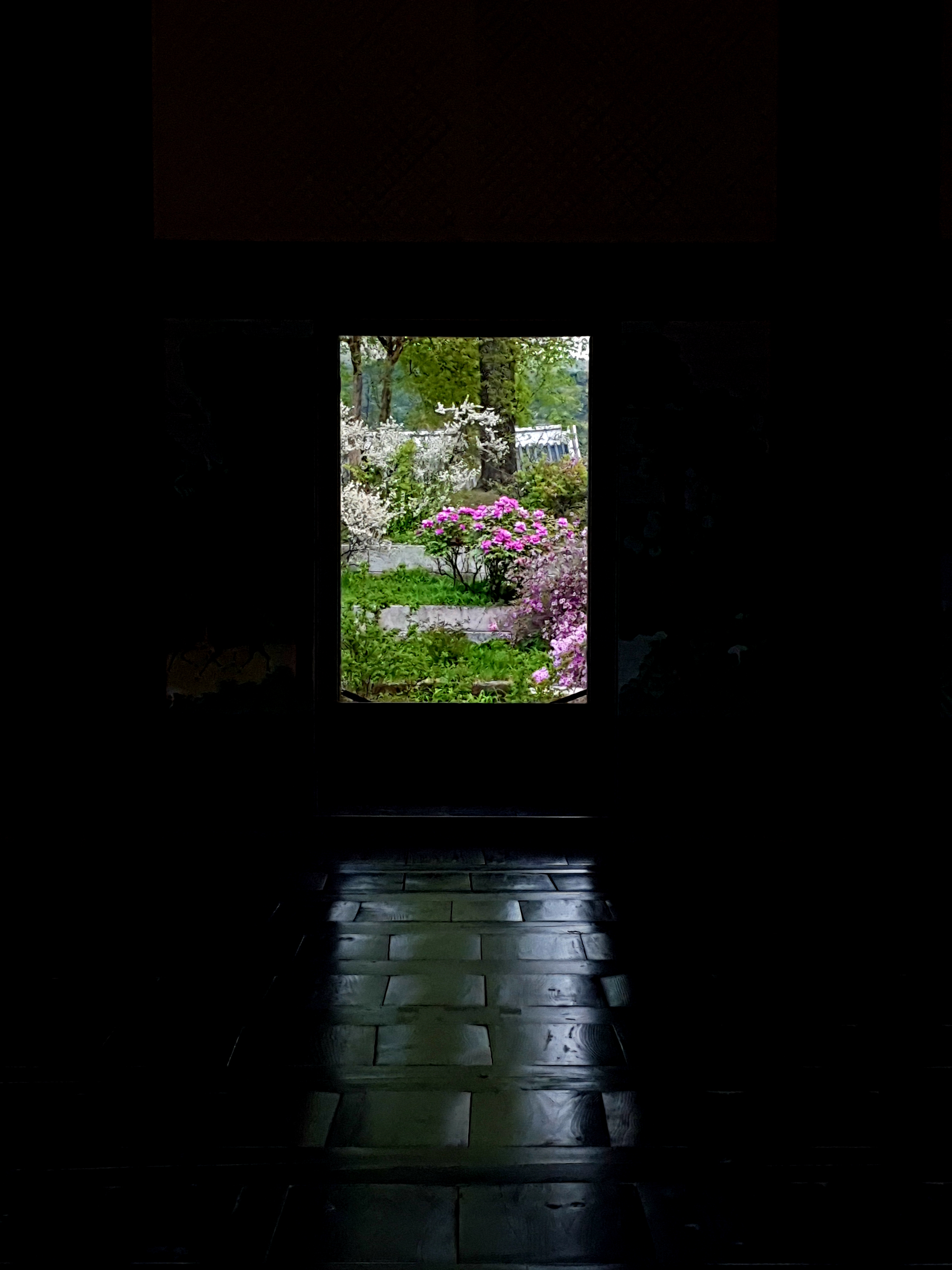 활짝 열어제킨 마루 뒷문 가운데 저 너머 아미산에 망발한 꽃 한 뭉치 넘실너울한다.