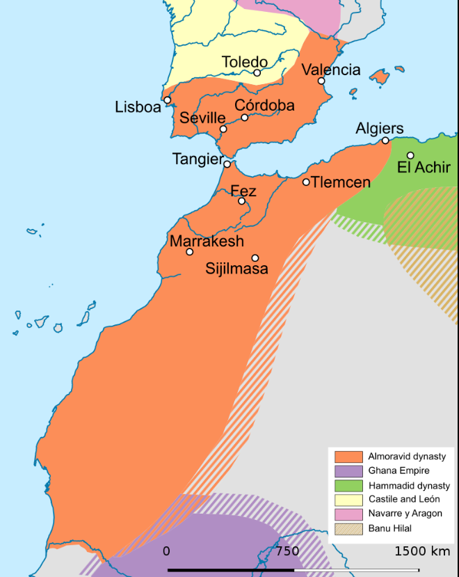 알모라비드 왕조 Almoravid empire 는 존속 기간이 백년 정도밖에 되지 않는 단명 무슬림 왕국이다. 대략 1050년대 태동해서 1147년에 알모하드 왕조 the Almohads 에 멸망했으니, 앞 지도는 1120년 무렵 그 최대 판도라 한다.