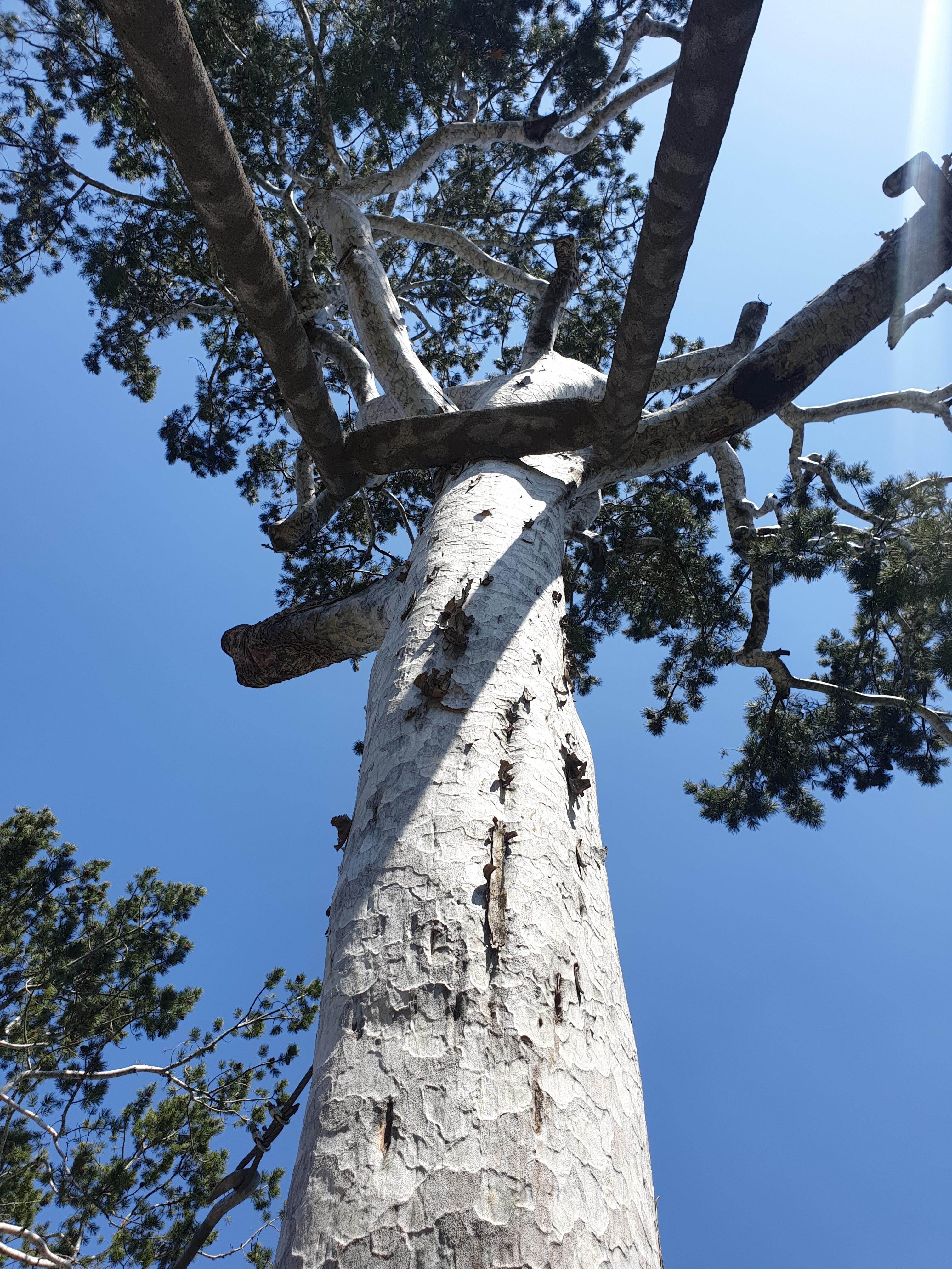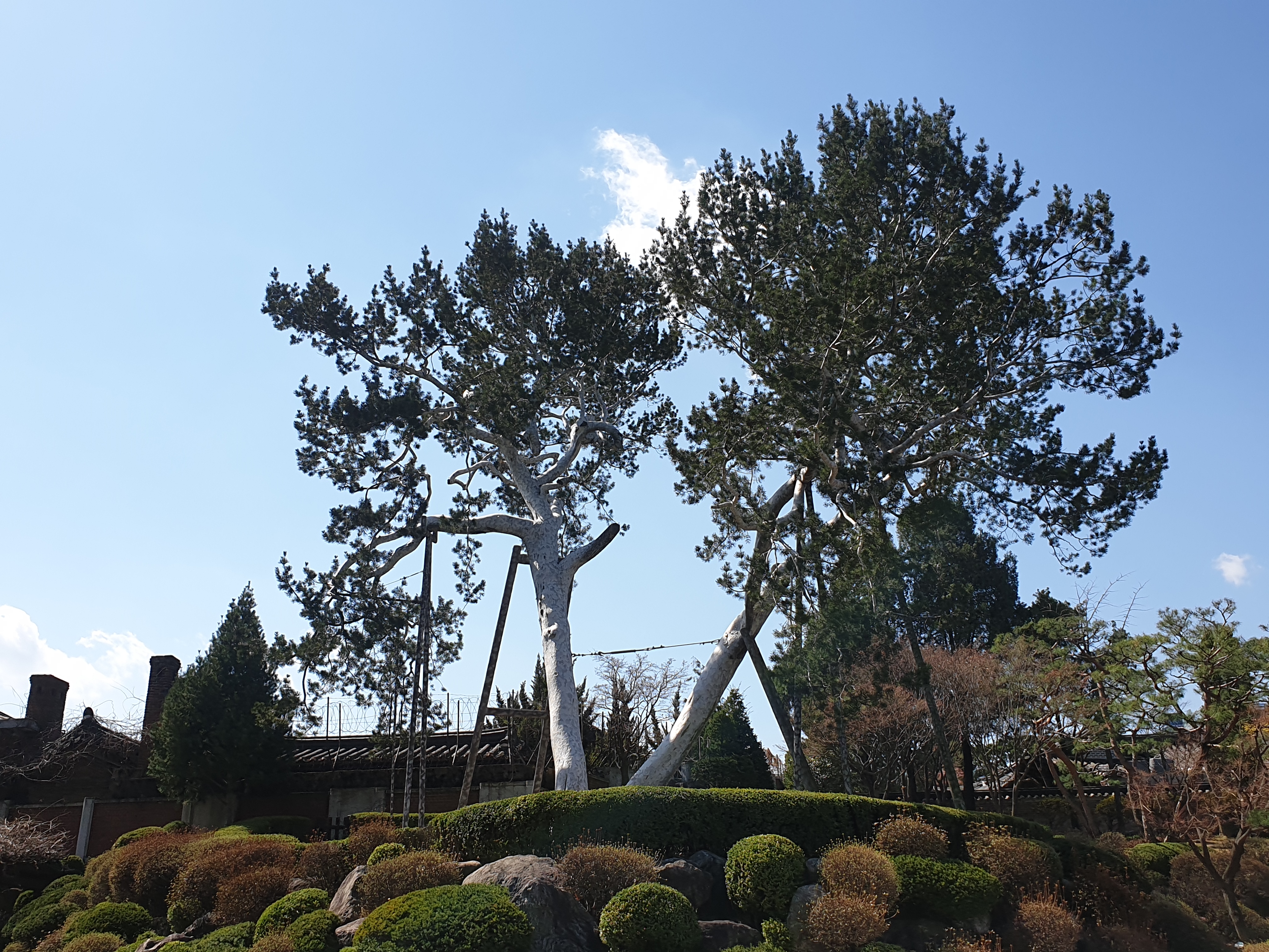한번 찾아보마 해서 방문자명부 입구서 작성하고선 경내 들어서 오른편으로 돌아 뒤안 언덕배기 우뚝 선 채 둥치서 두 갈래로 번져나간 백송을 마주한다.