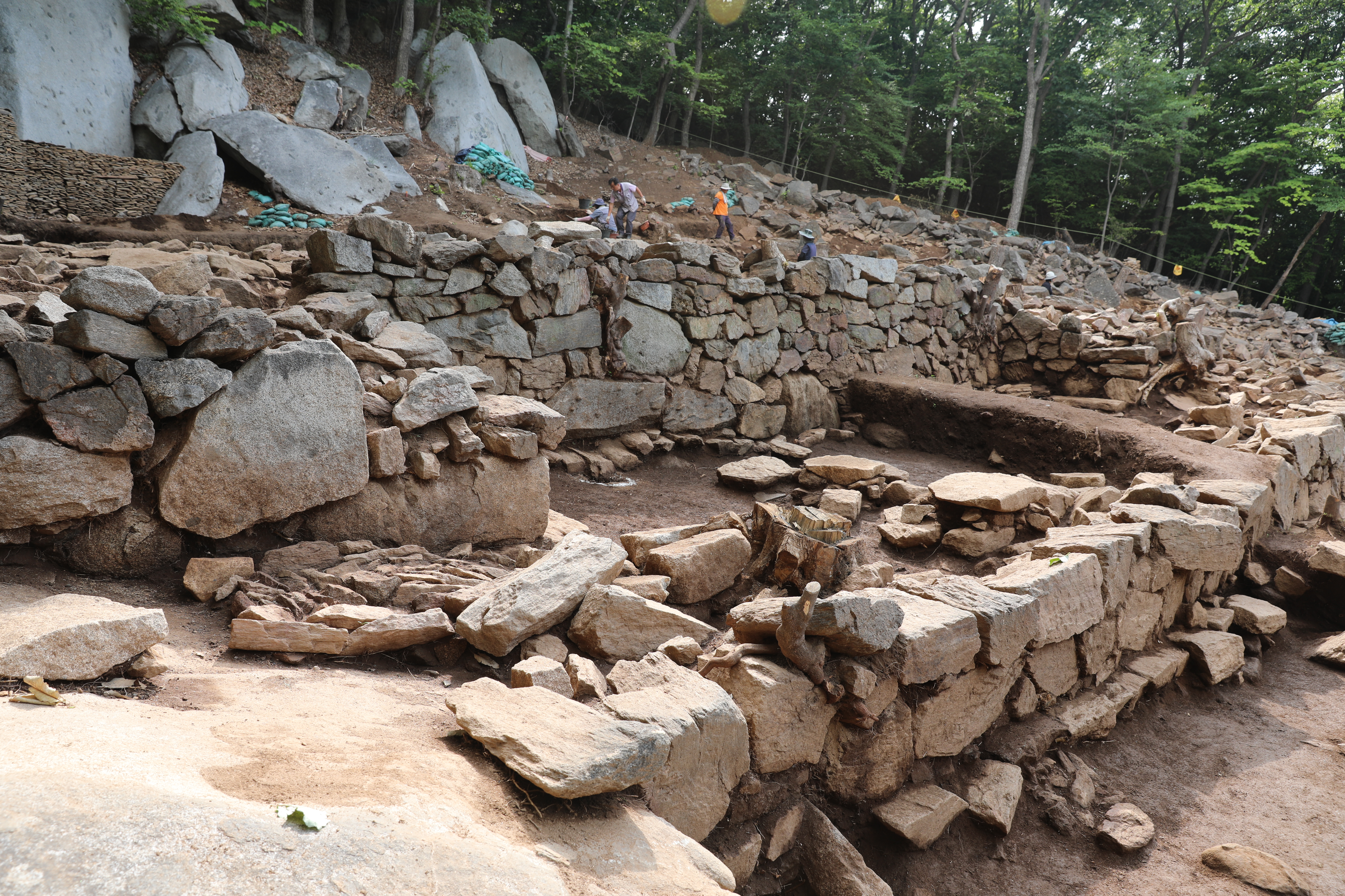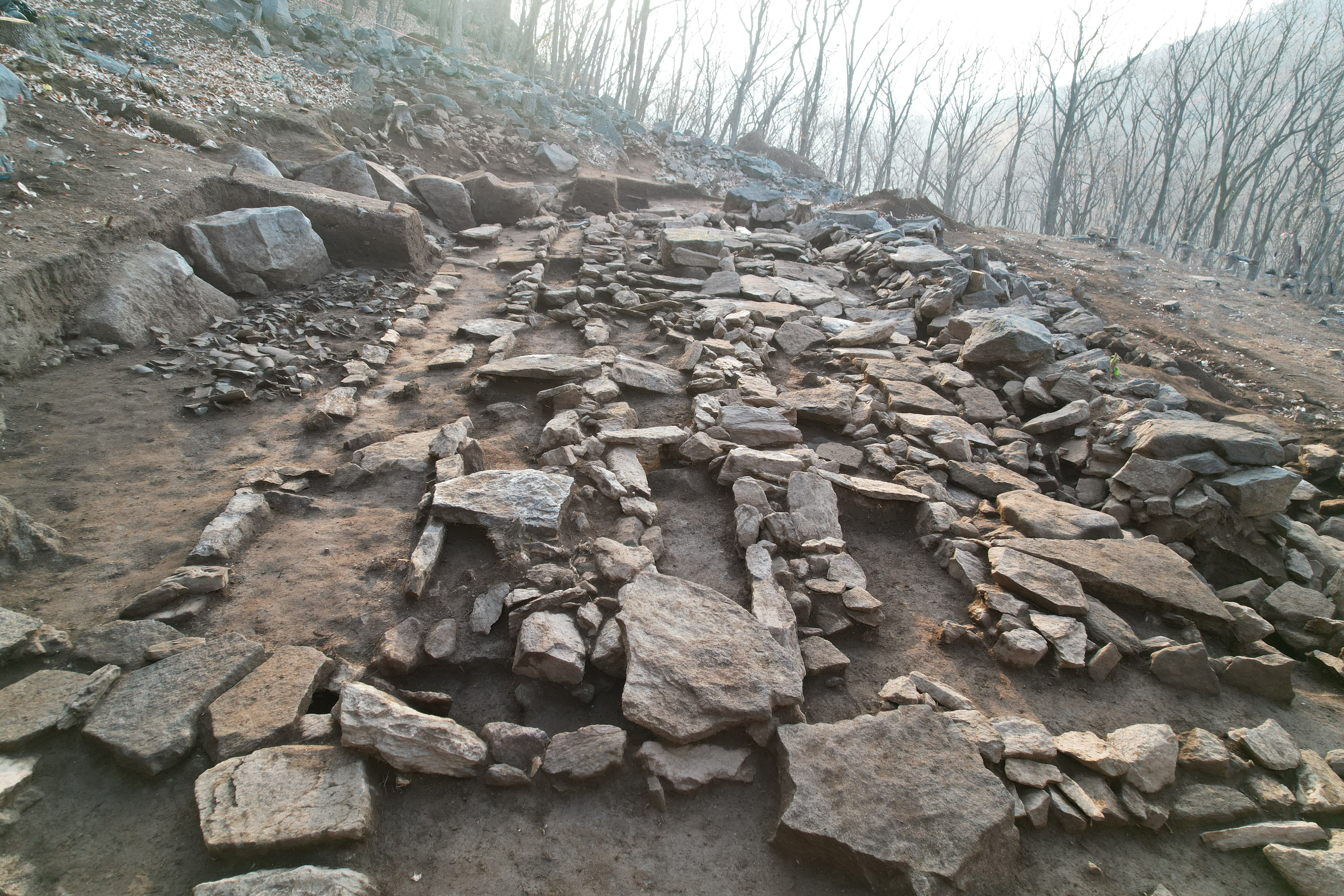 아랫단 평탄대지 동쪽에 나란한 2개 부속 건물에서는 내부에 아궁이와 부뚜막, 온돌시설을 확인했다 하는데, 저 사진만으로는 솔까 건물지 2 정도만 확실하고 건물지 3은 나로서는 아리숑숑하다.