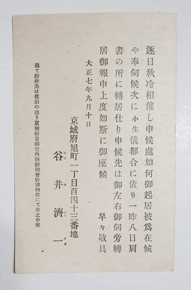그리고 이사했다는 사실을 관제엽서에 인쇄하여 지인들에게 보낸다. 그 중의 한 장이 최근 세상에 나왔다.