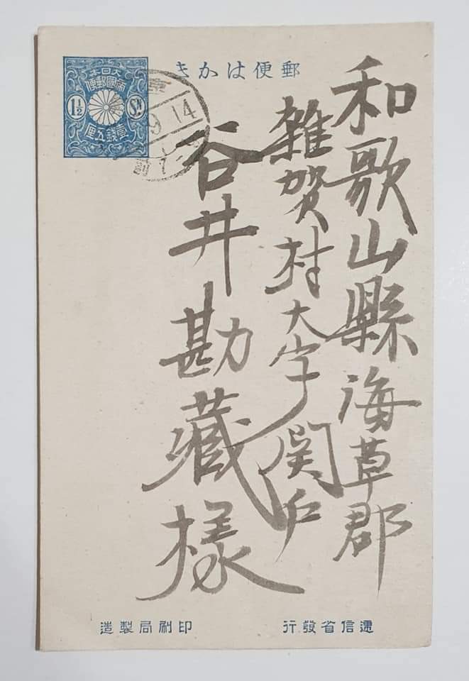 그런데 이 엽서는 다른 것하고는 구별되는 사연이 있다. 바로 이 엽서를 받는 와카야마현의 야쓰이 간조谷井勘藏란 사람이 다른 이도 아니고 야쓰이 세이이쓰 본인의 아버지라는 사실!