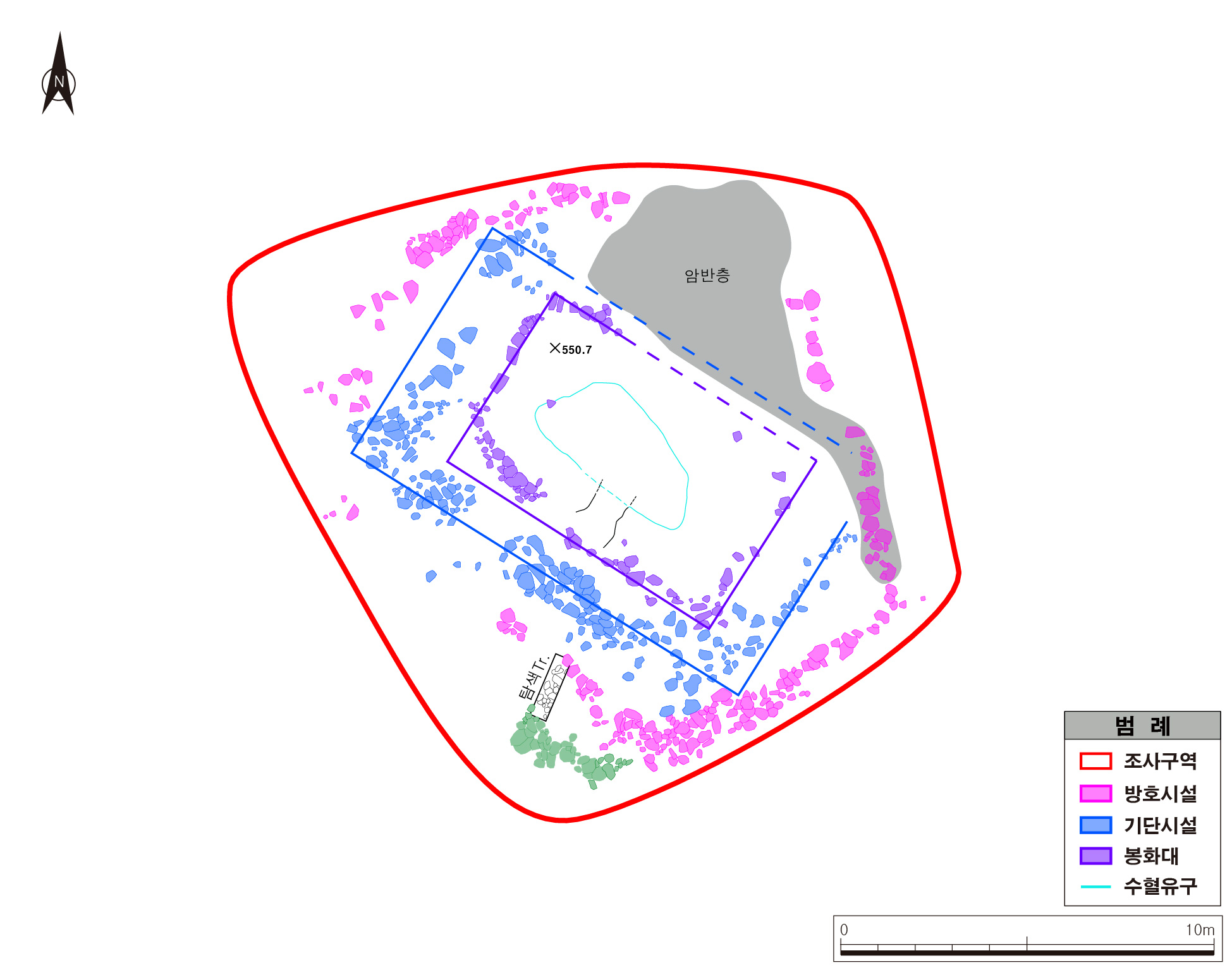 조사면적 249㎡는 평면 방형에 가깝다. 표토층 아래로 암반쇄석물이 포함된 회색사질점토층-풍화암반층·자연암반층(생토층)이 확인됐다. 연대(???) 안쪽으로는 회백색사질점토 다짐층과 흑갈색 사질점토층이 단면 ‘U’자형으로 드러난다. 또한 연대와 2차 기단 사이에는 연대 안쪽의 회백색사질점토 다짐층과는 점질에서 차이가 있는 회백색사질점토층이 드러나기도 했다.