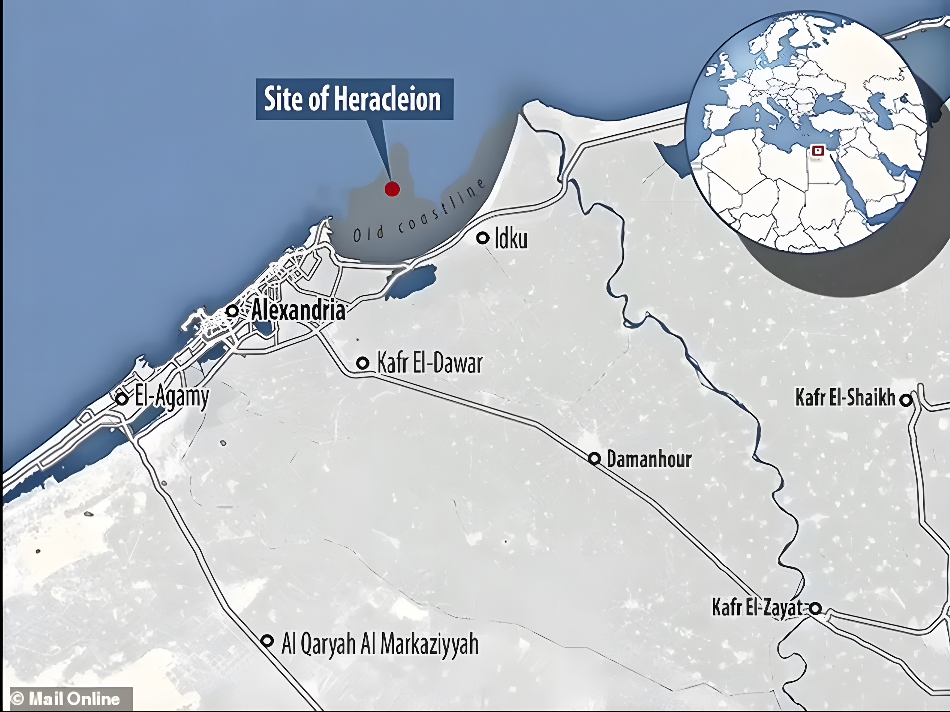 토니스-헤라클레이온(Thonis-Heracleion)은 지중해 알렉산드리아에서 북동쪽으로 약 32km, 현재 해안에서 7km 떨어진 토니스-아부키르 만 Thonis- Abu Qir Bay에서 북쪽으로 72km 떨어진 나일강 하구 Canopic Mouth 근처에 위치한다.