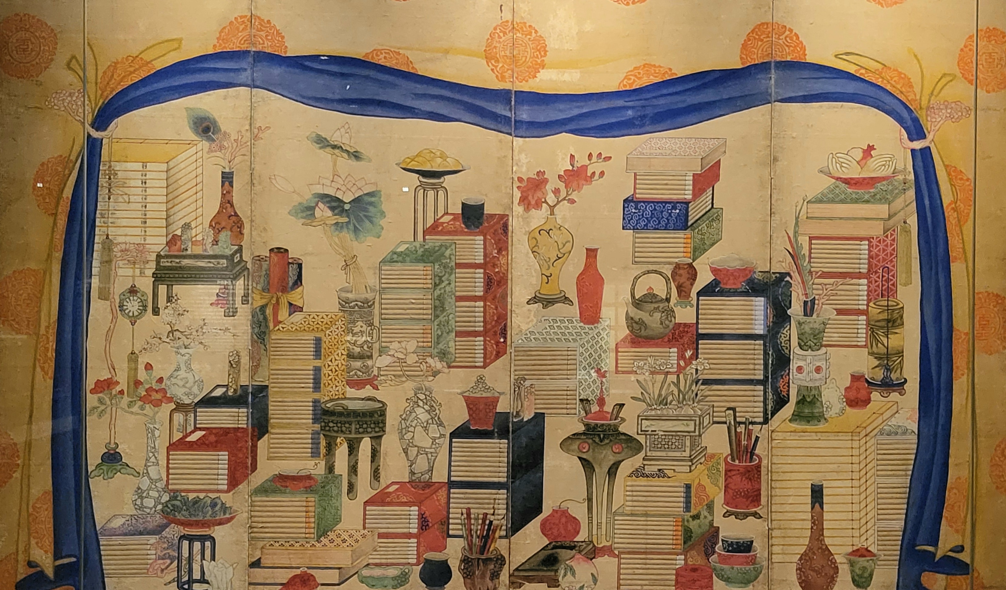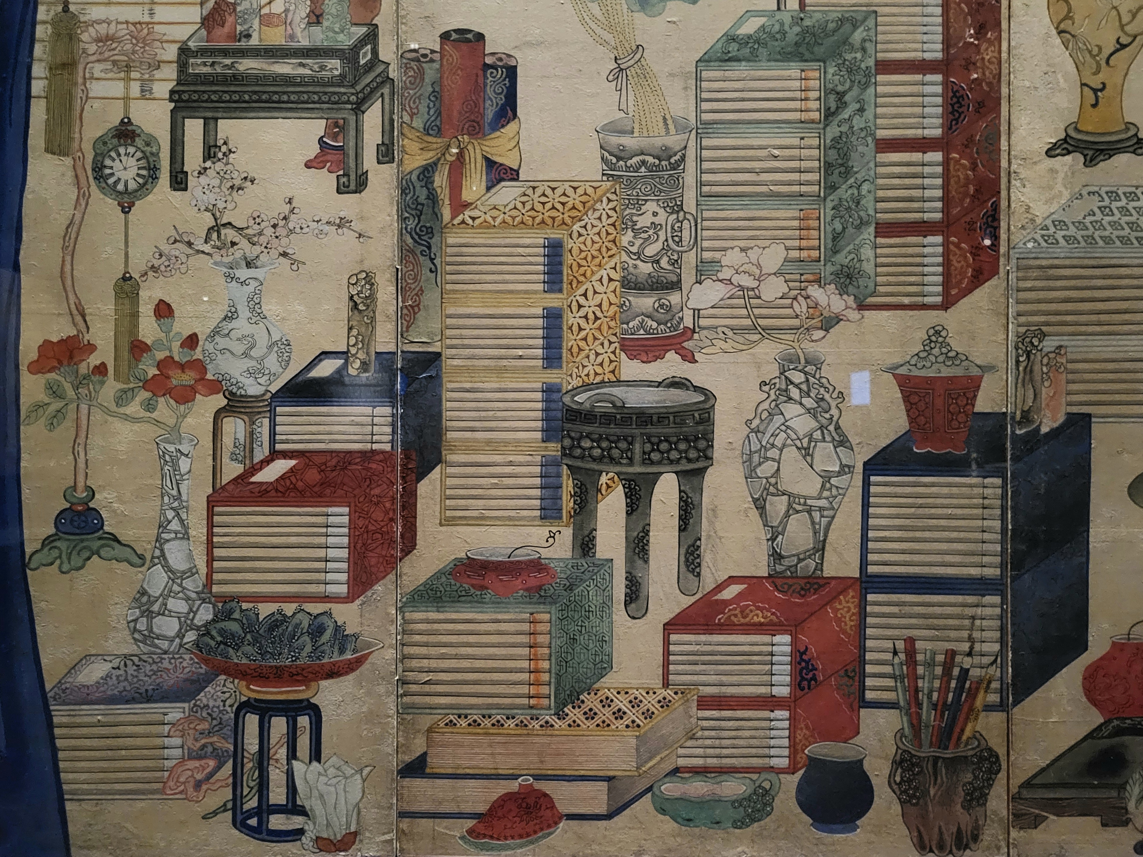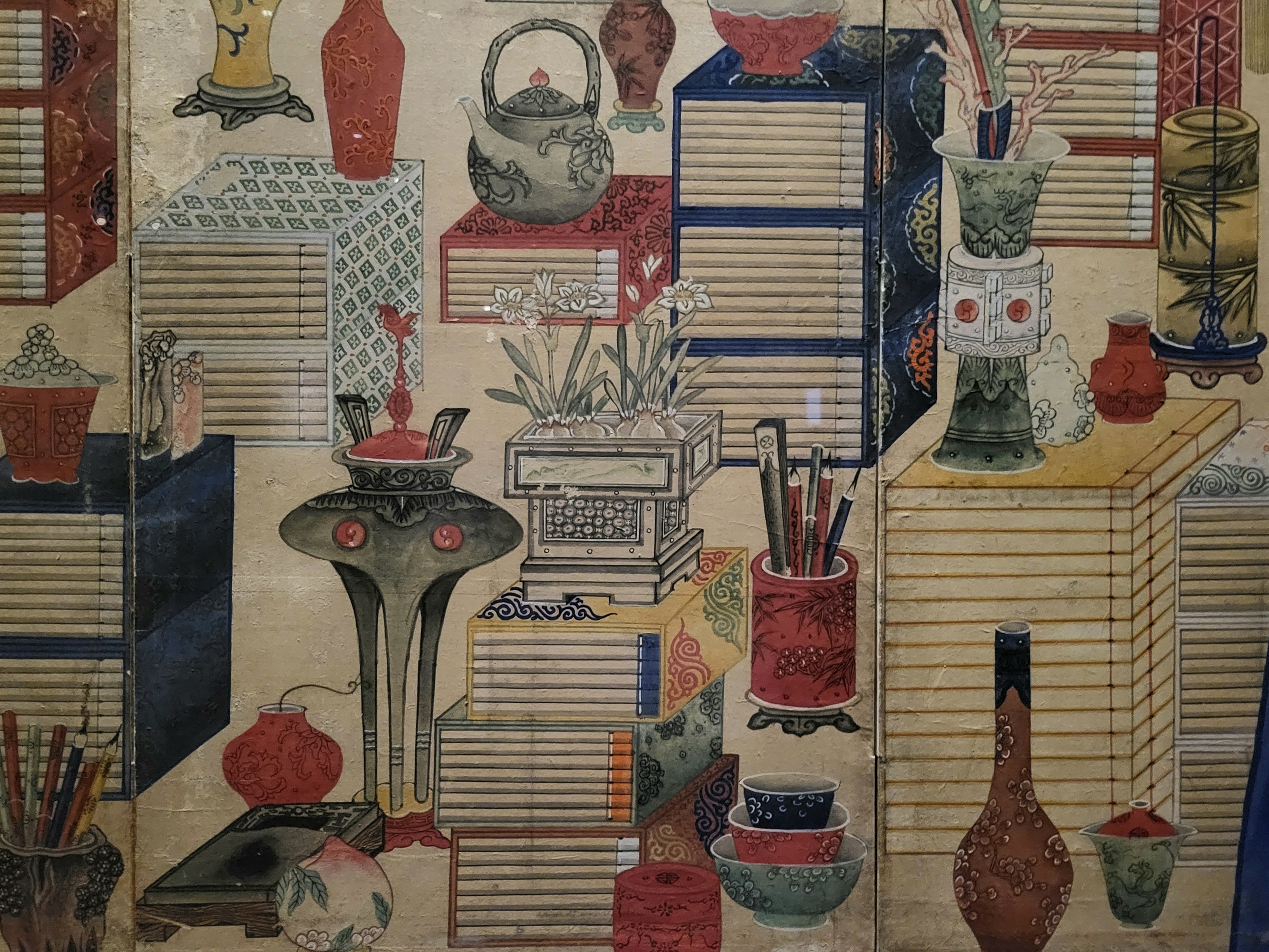 This is a four-panel folding screen that features scholarly possessions and other associated items including ceramics, curios, and potted plants.