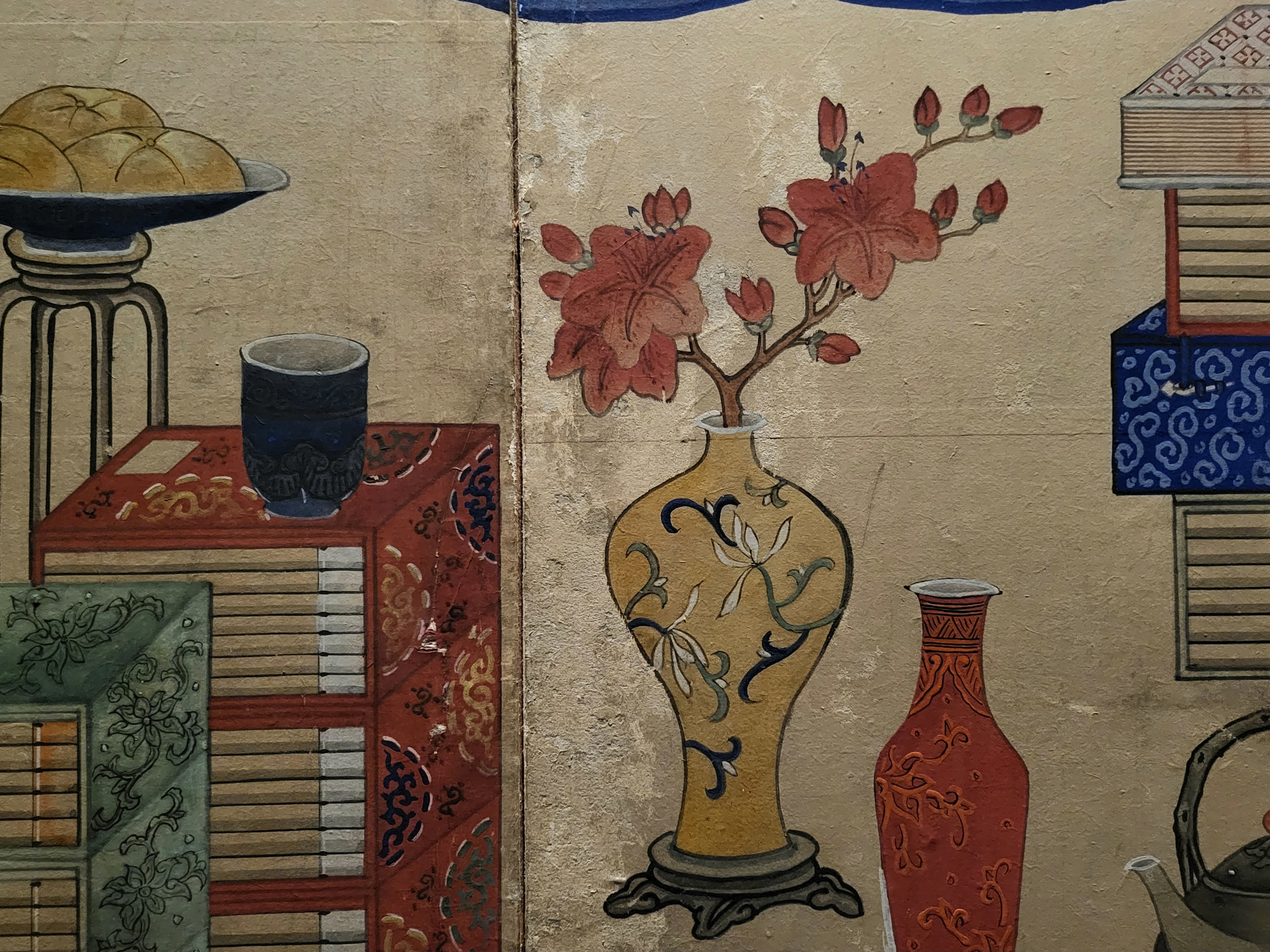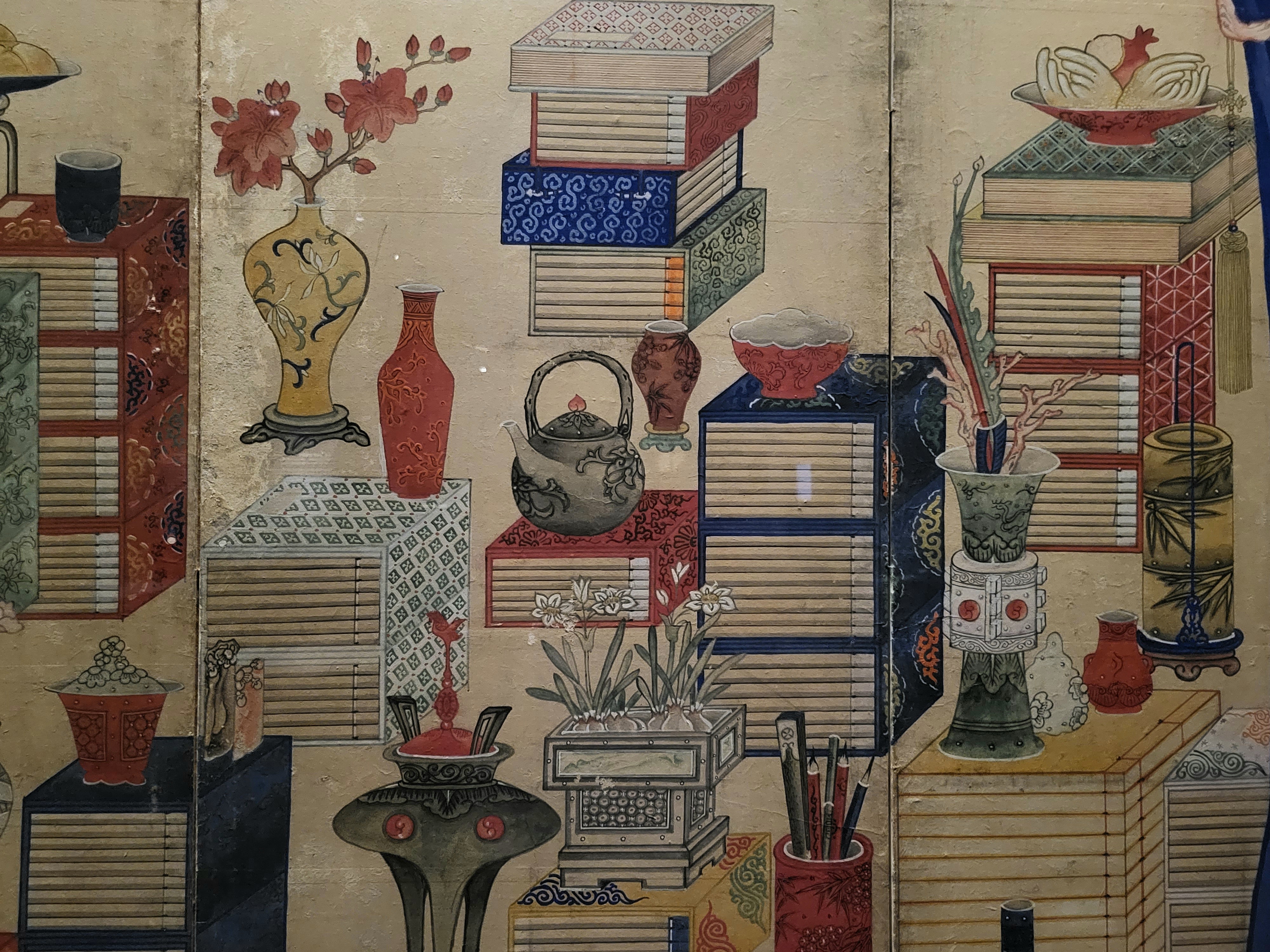 전체 모양은 요런데 조선후기 근대 초기 비교적 자주 보는 책가도 소재 병풍으로 지금 국립고궁박물관에 걸려 있다.