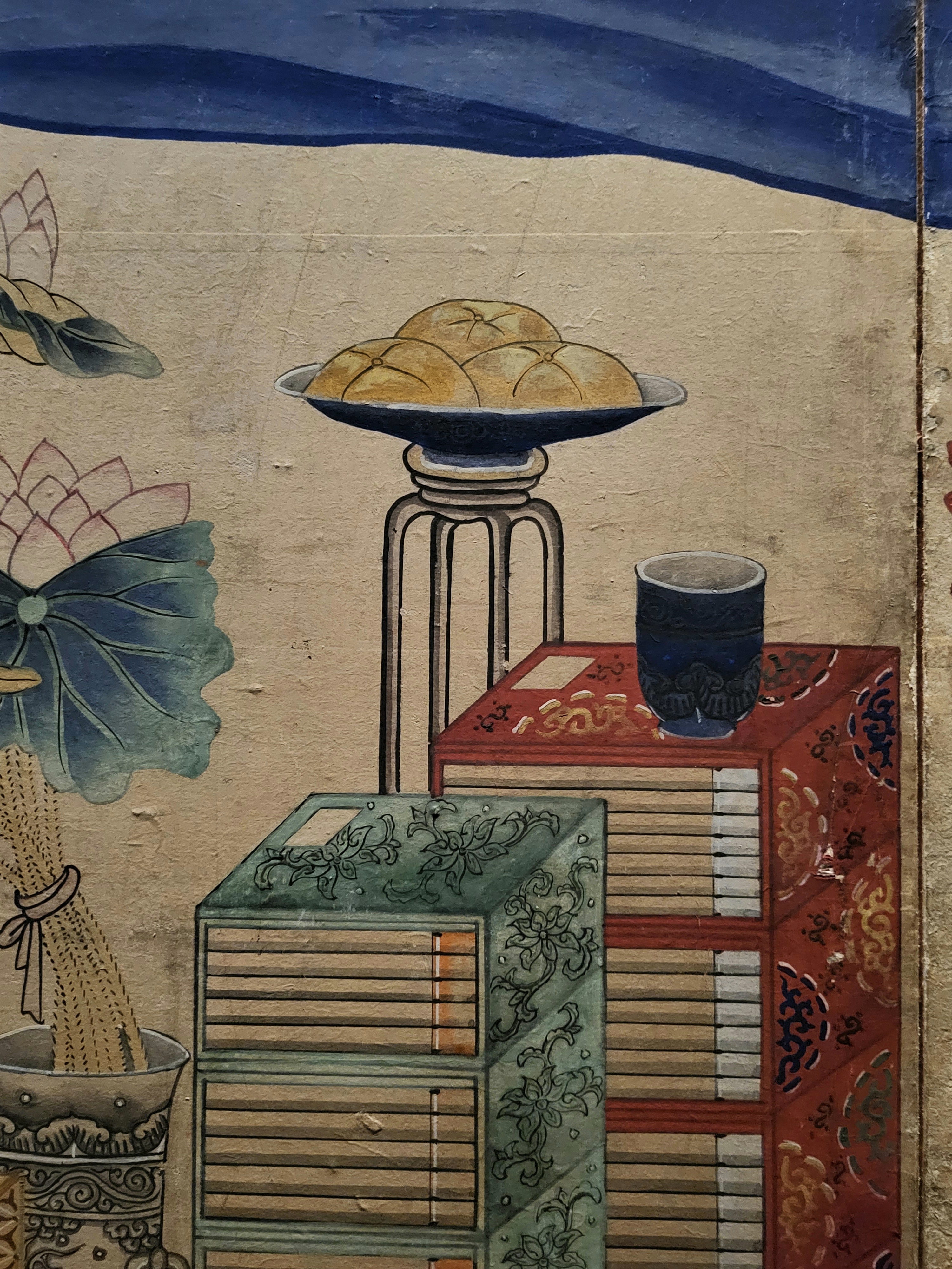 This decorative folding screen with auspicious connotations gives a glimpse into the high quality of and exceptional technique used in the royal decorative paintings.