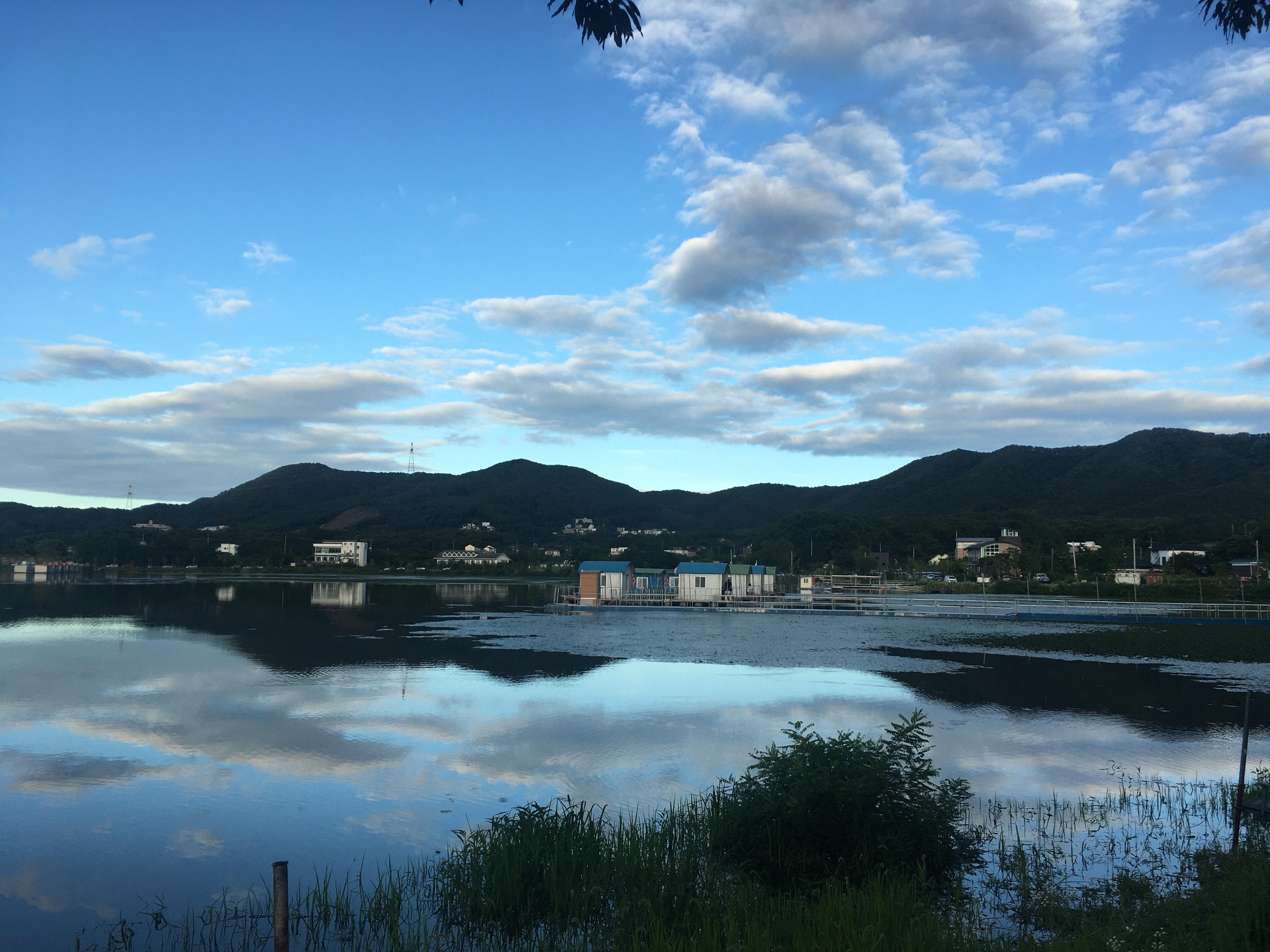 그런데 오늘 아침 우연히 본 용담저수지는 비가 지나간 맑은 하늘과 하얀 구름 그리고 문수산을 담고 있었는데, 이 모습 너무 예쁘지 않은가.