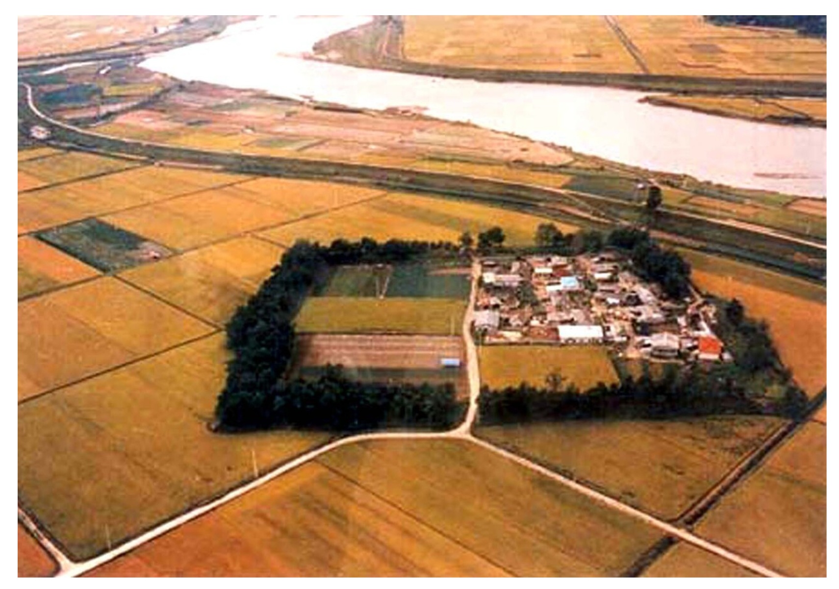 방형 성벽을 따라 방풍림이 들어서고 그 안에는 절반가량이 마을이고 나머지 절반은 논이었다.