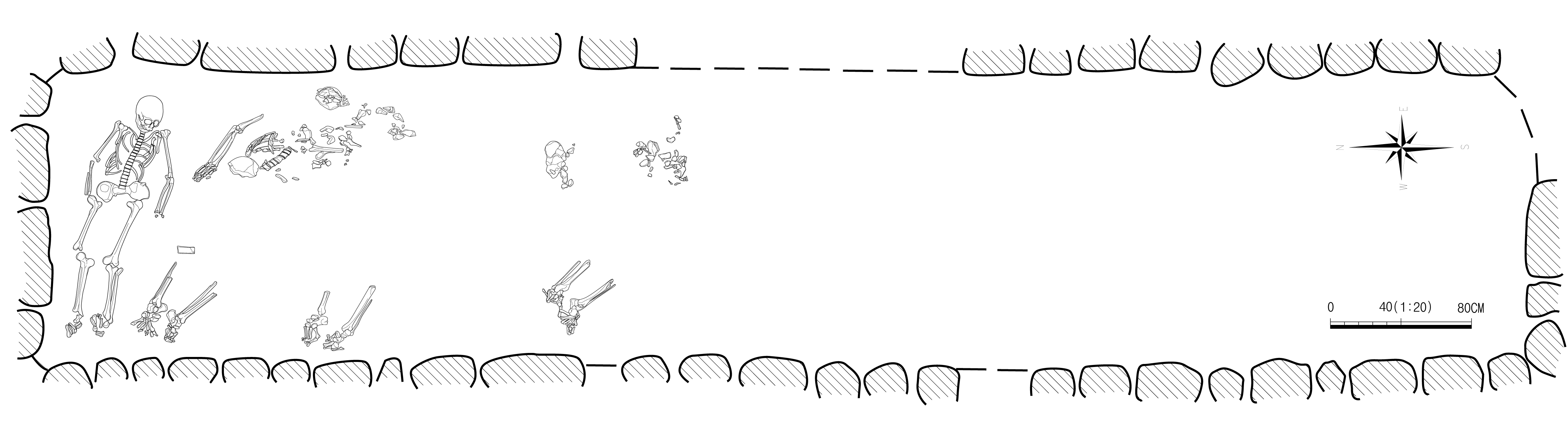 오래 전에 도굴된 것으로 보아 중요 유물 대부분이 사라졌지만 석실 남쪽 벽 근처에서는 무덤의 주인공 시신을 놓았던 길이 2.70m짜리 단(壇)이 드러났고, 그 반대편(북쪽 벽)에서는 순장자 4구의 해골과 토기를 비롯한 관련 부장품이 발견됐다. 무덤의 주인공인 주(主) 피장자가 머리를 남쪽, 다리는 북쪽으로 둔 데 비해 그 반대편 순장자 시신 4구는 모두 석실 너비 방향인 주 피장자와는 전혀 반대 방향인 동쪽으로 머리가 향하도록 배치됐다.