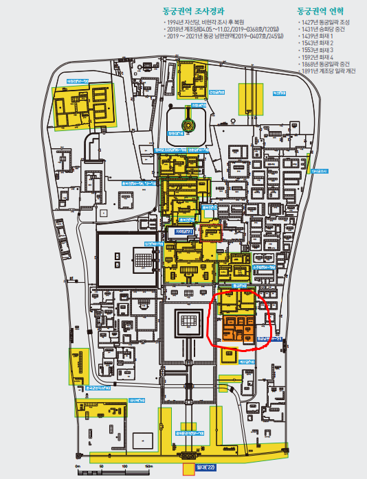 이번에 발굴된 화장실은 동궁 권역 중에서도 남쪽 지역에 위치하며 동궁과 관련된 하급 관리와 궁녀, 궁궐을 지키는 군인들이 주로 이용하였을 것으로 추정된다. 동궁 권역의 건물들은 1868년(고종 5년)에 완공되었으나, 일제강점기인 1915년에 조선물산공진회장이 들어서면서 크게 훼손되었다.