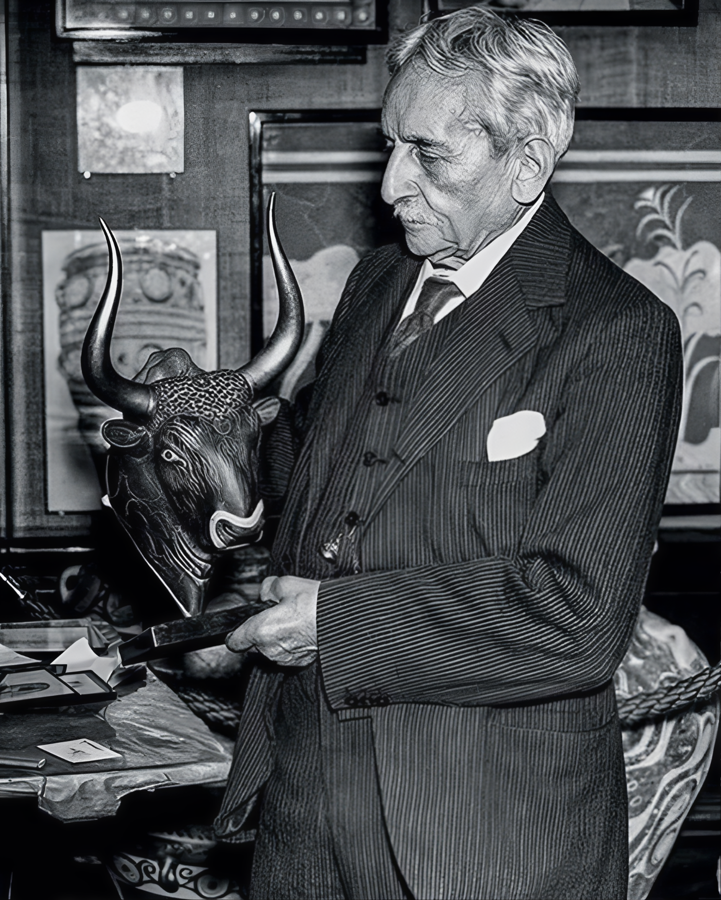 놀라운 장인 솜씨를 보여주는 이 조각은 사실적인 근육 라인부터 상감 세공된 주둥이까지 모든 요소가 황소에 생동감을 불어넣는다.