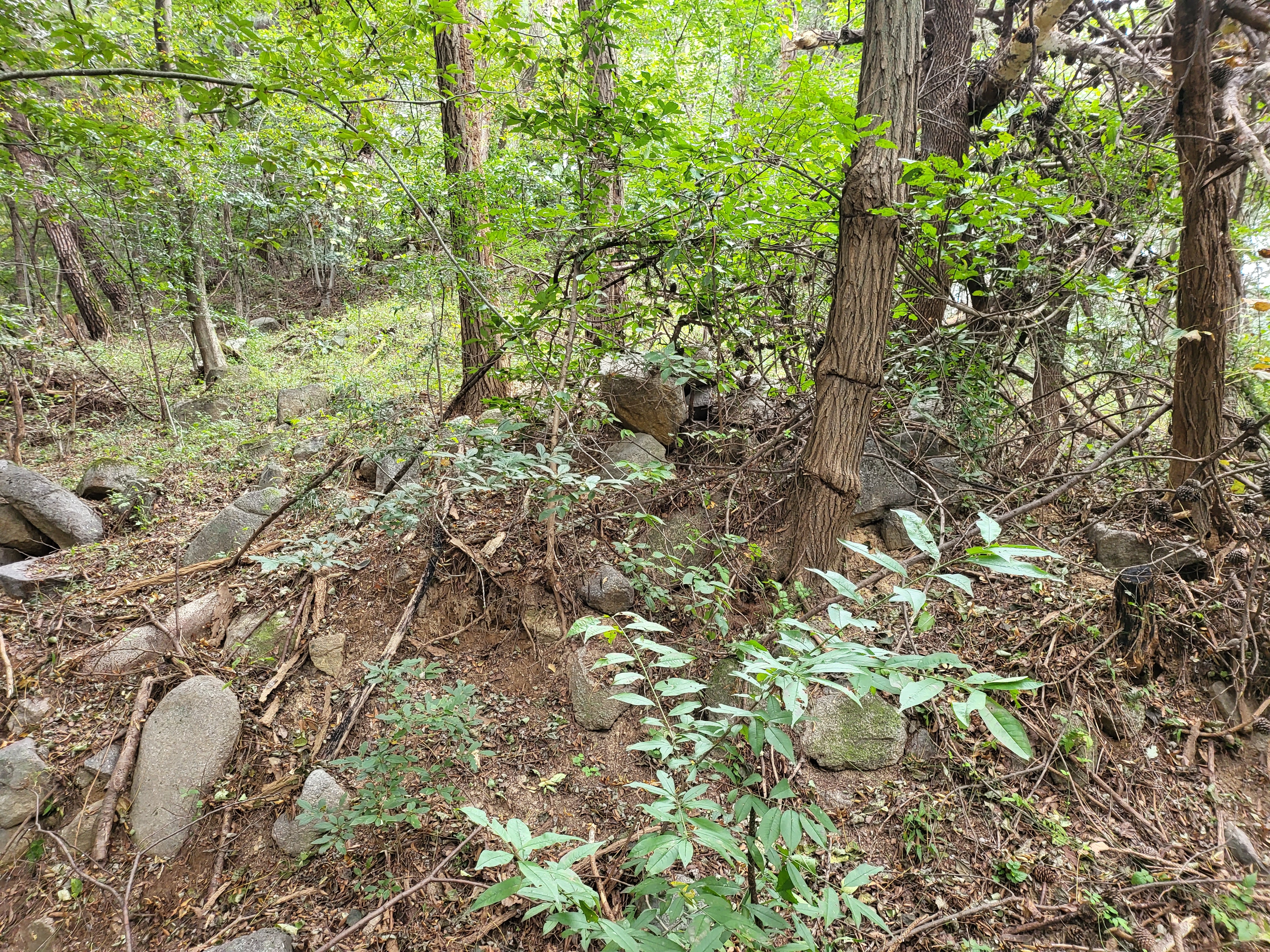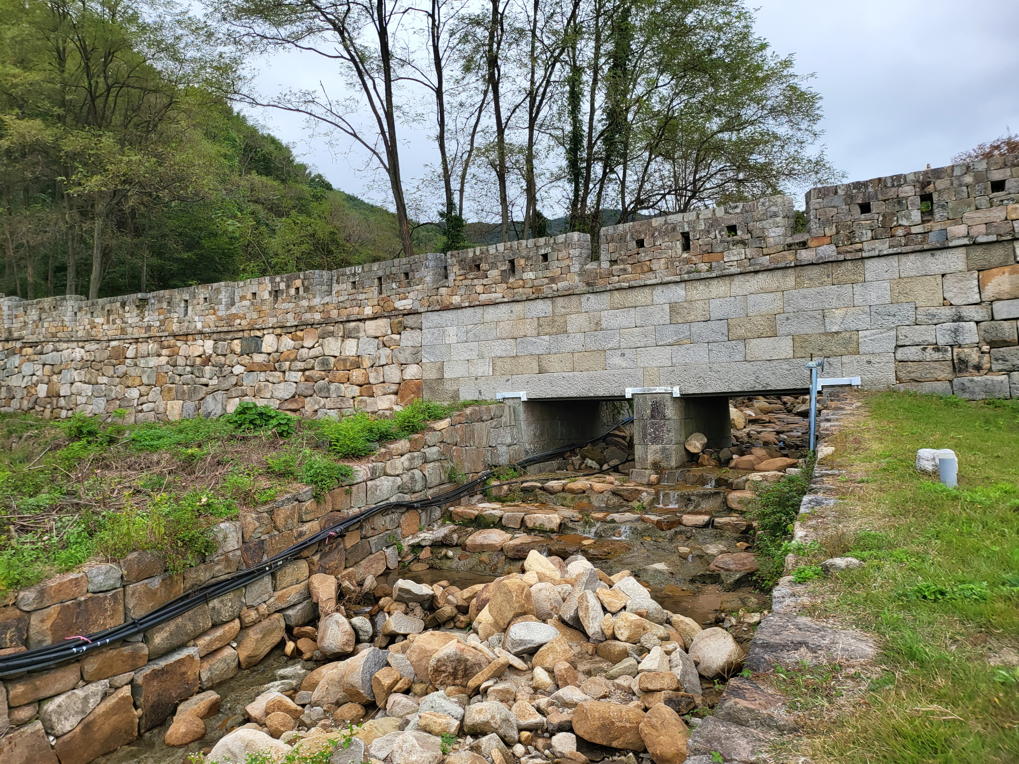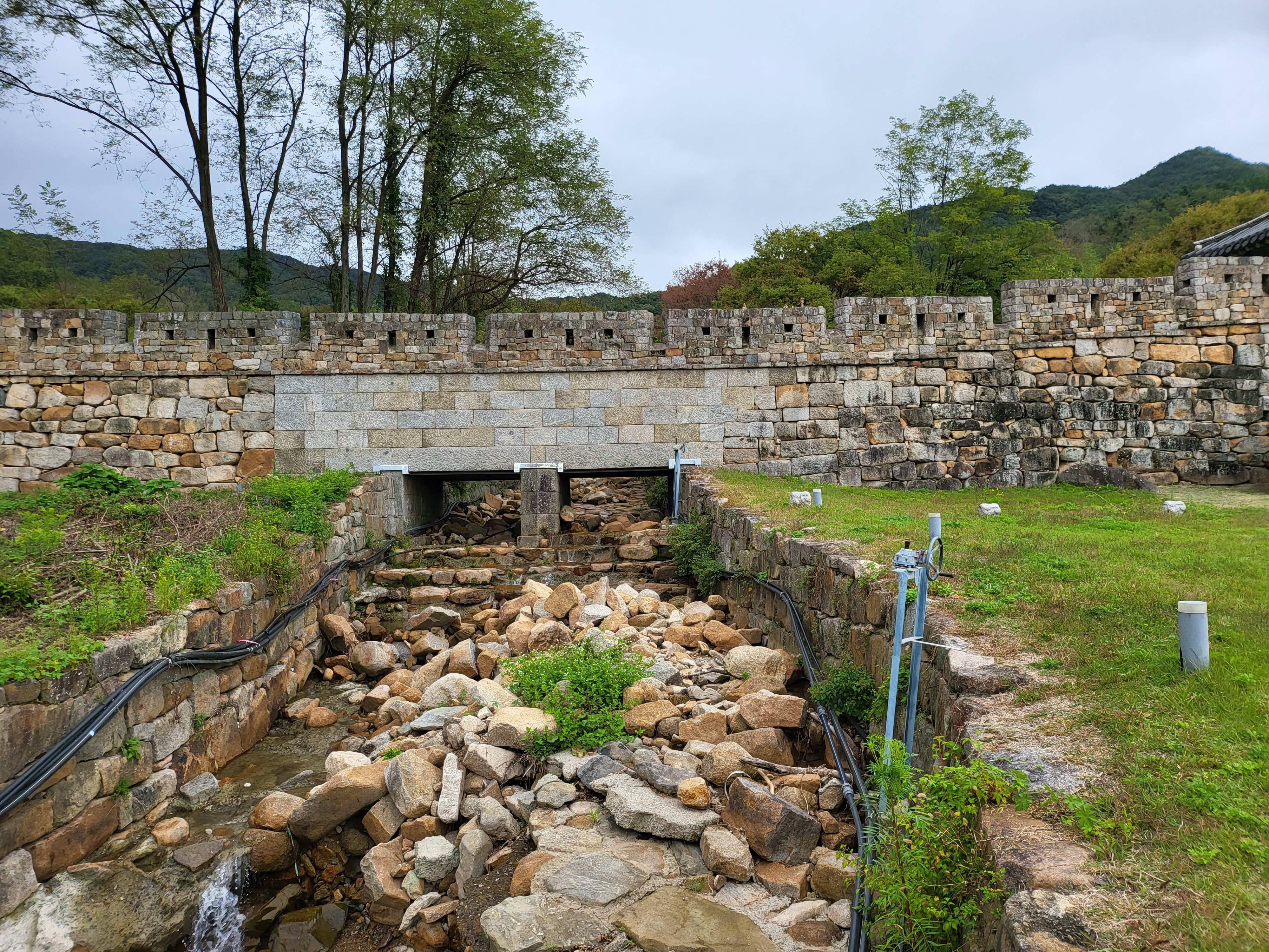 비록 손댄 모습이지만 산성은 물과의 싸움이라는 숙명이 있어 물이 나거나 흐르는 계곡지점에 집수정인건 나발이건 물 저장창고를 만들기 마련이며 또 그걸 밖으로 빼내는 배수구가 있어야 할 게 아닌가 하는 평범성을 이 산성 저처럼 명확히 보여주는 데 있는가?