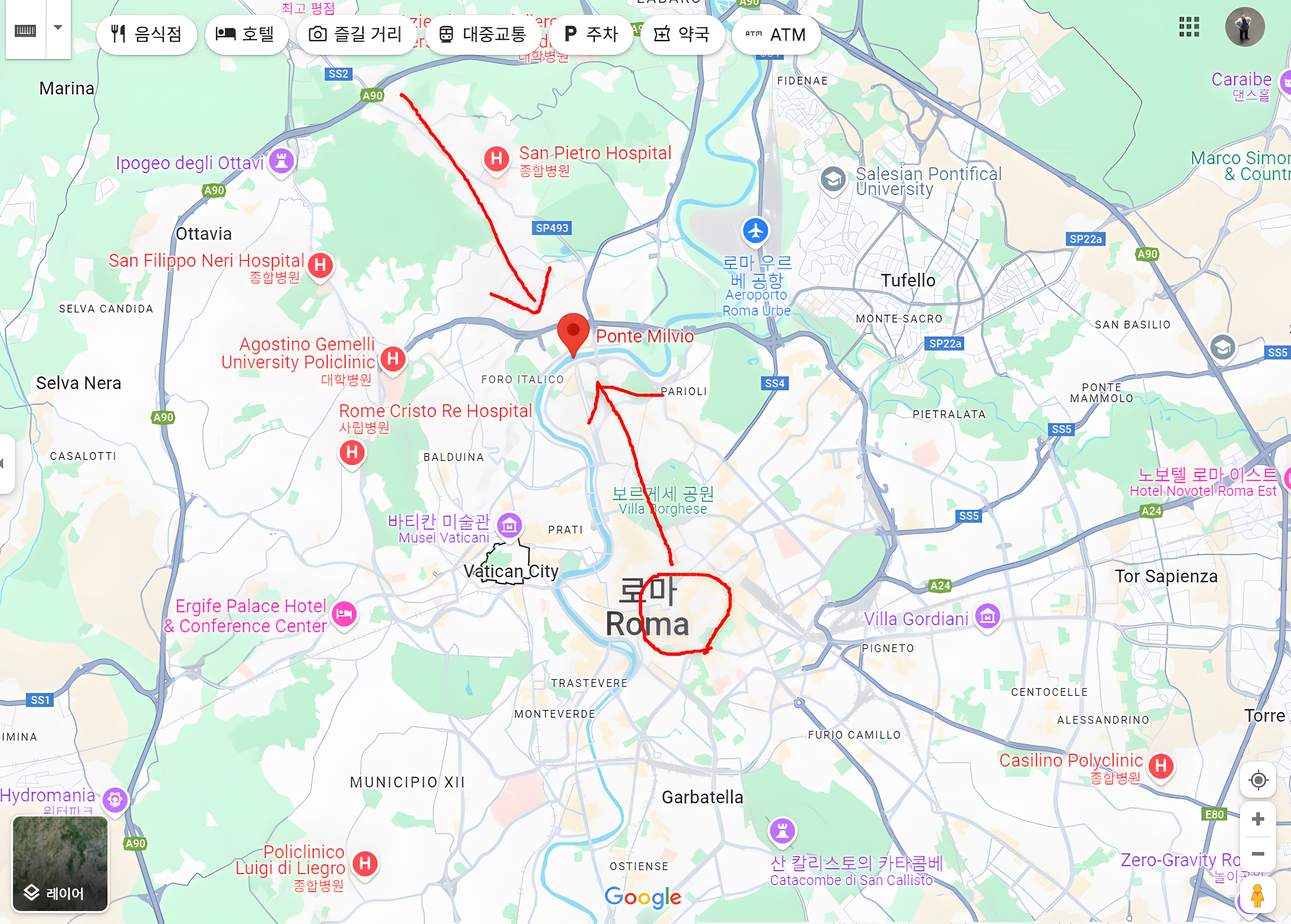 당시 로마 제국 수도 최중심으로 북서쪽으로 감돌아 흐르는 테베르 강을 가르지르는 로마 왕궁 중심으로 북서쪽이라는 사실이다.