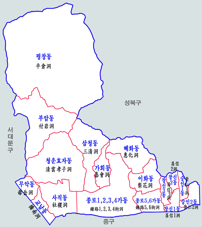 이게 종로구 행정구역이다. 저기에 무슨 바둑판식 조방제가 가당키나 하단 말인가? 저게 바로 신라 전성시대 금성 중심구역이다.