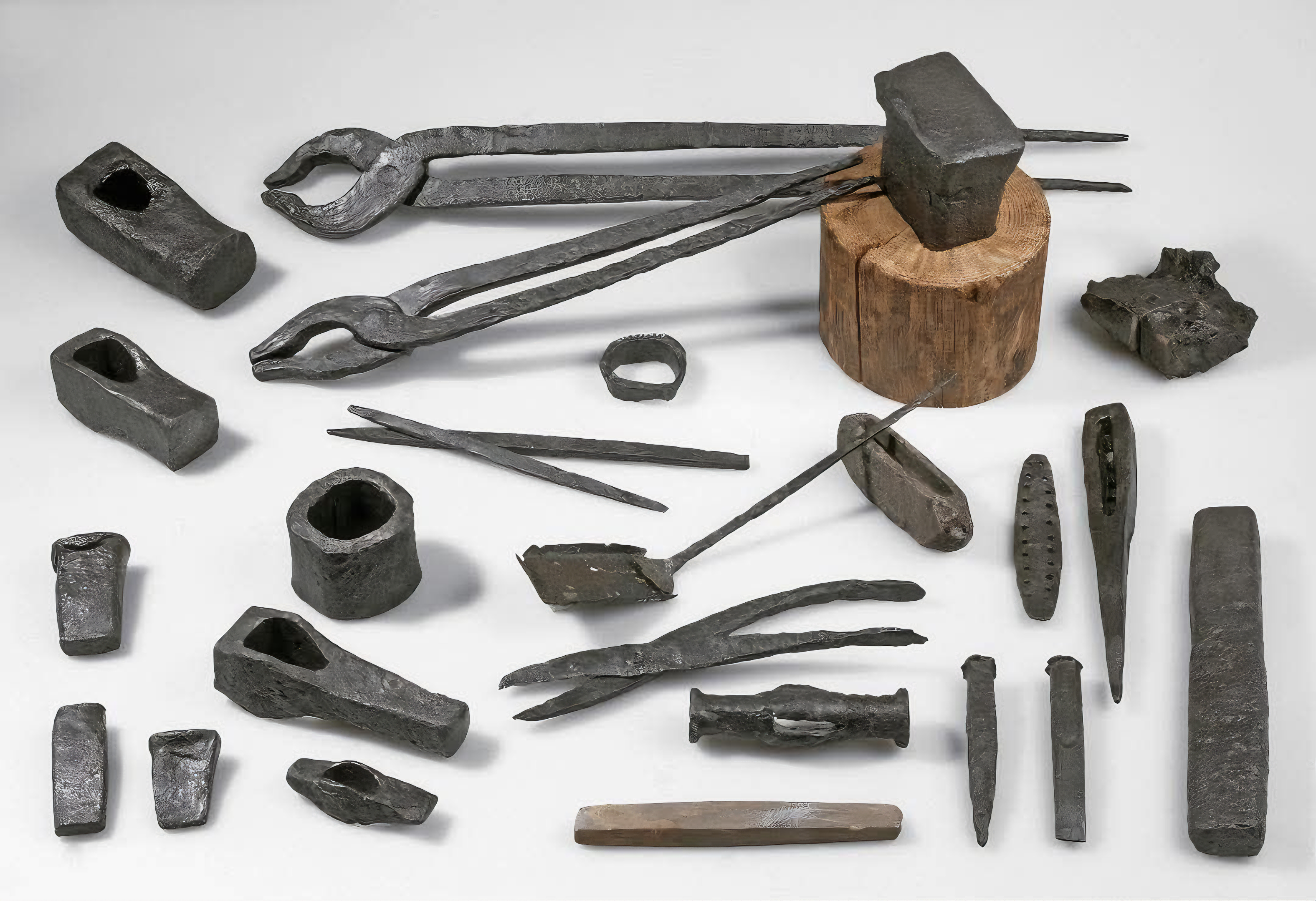 무거운 쇠망치sledgehammers, 작은 끌, 펀치부터 활석 주형soapstone mould 위에 올린 납과 주석을 녹이는 긴 손잡이 철제 팬까지 다양한 도구가 포함되어 있다.