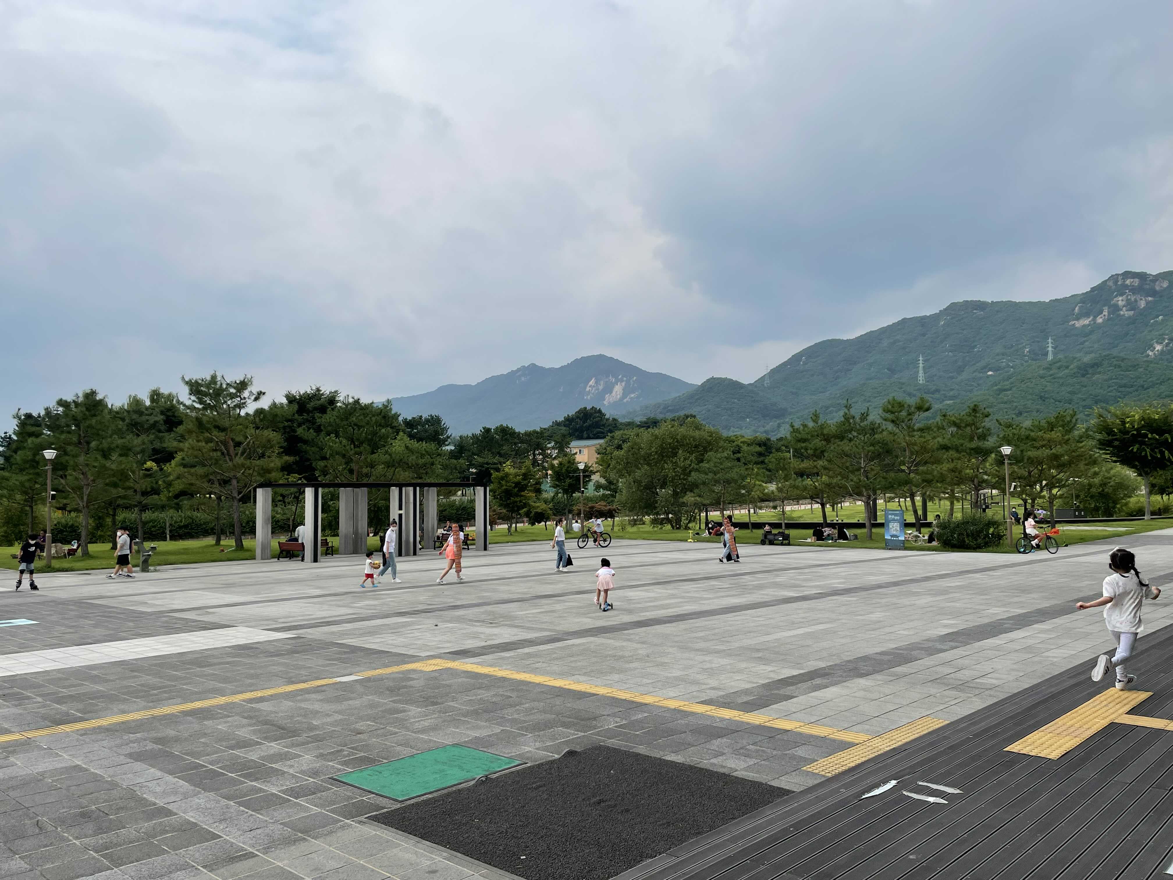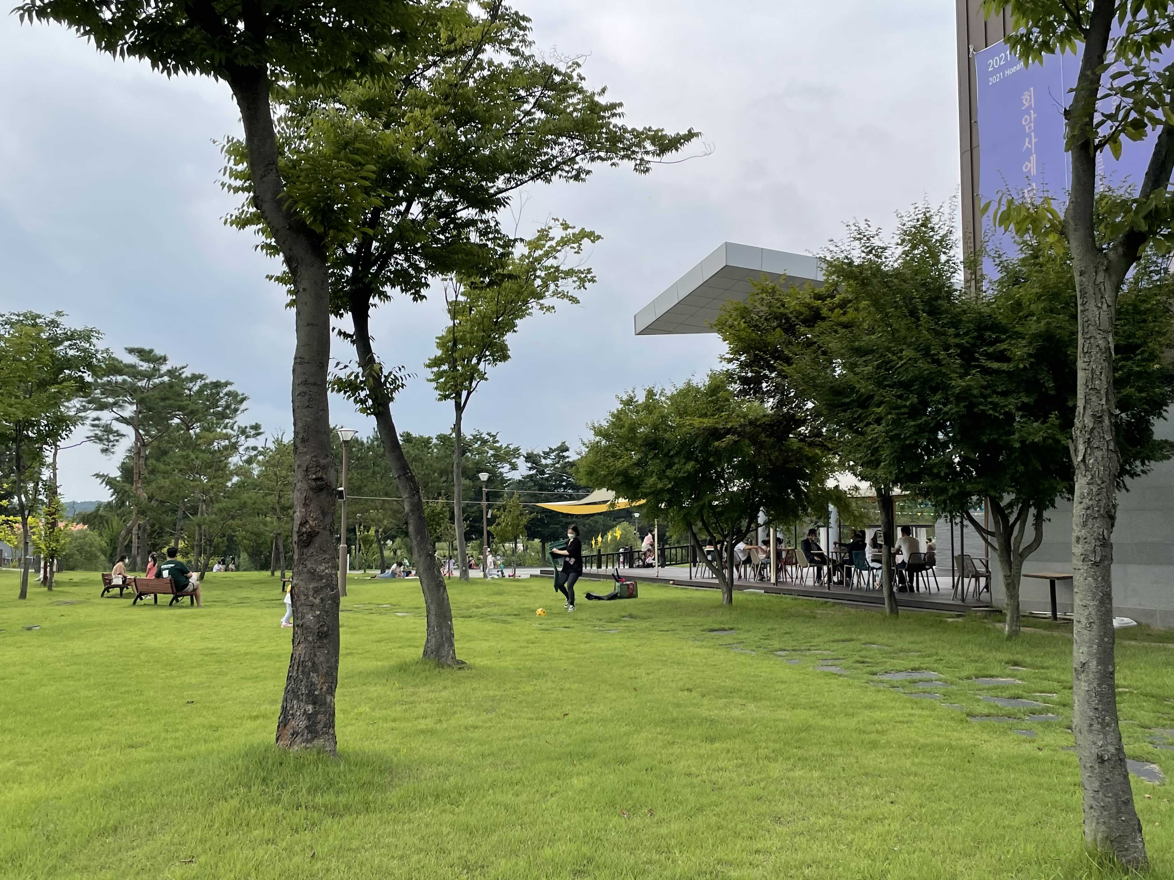 박물관 마당에서 뛰어 노는 아이들, 공놀이 하는 아빠와 아들, 잔디에 앉아 커피 한 잔하는 어른들.