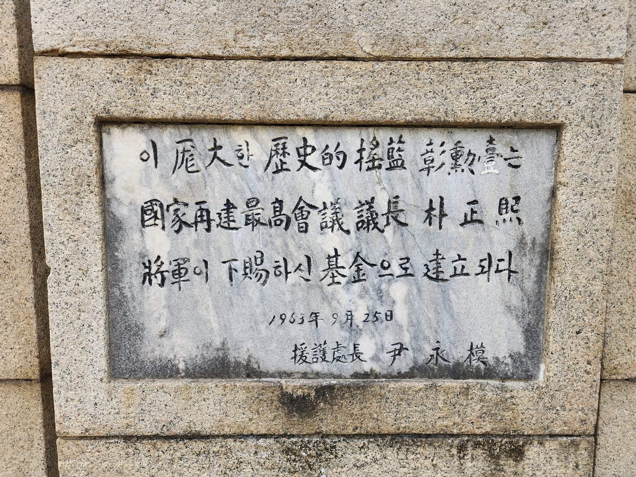 뒷면에는 "이 厖大한 歷史的 搖藍 彰勳臺는 國家再建最高會議 議長 朴正熙 將軍이 下賜하신 基金으로 建立되다 1963年 9月 25日 援護處長 尹永模"라는 문구가 새겨져 있다.