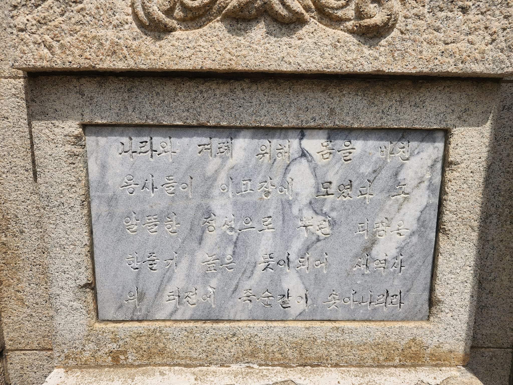 전면에는 "나라와 겨레 위해 몸을 바친 용사들이 이 고장에 모였다. 그 알뜰한 정성으로 뿌린 피땀은 한줄기 높은 뜻이 되어 새역사의 터전에 죽순같이 솟아나리라"라는 문구가,