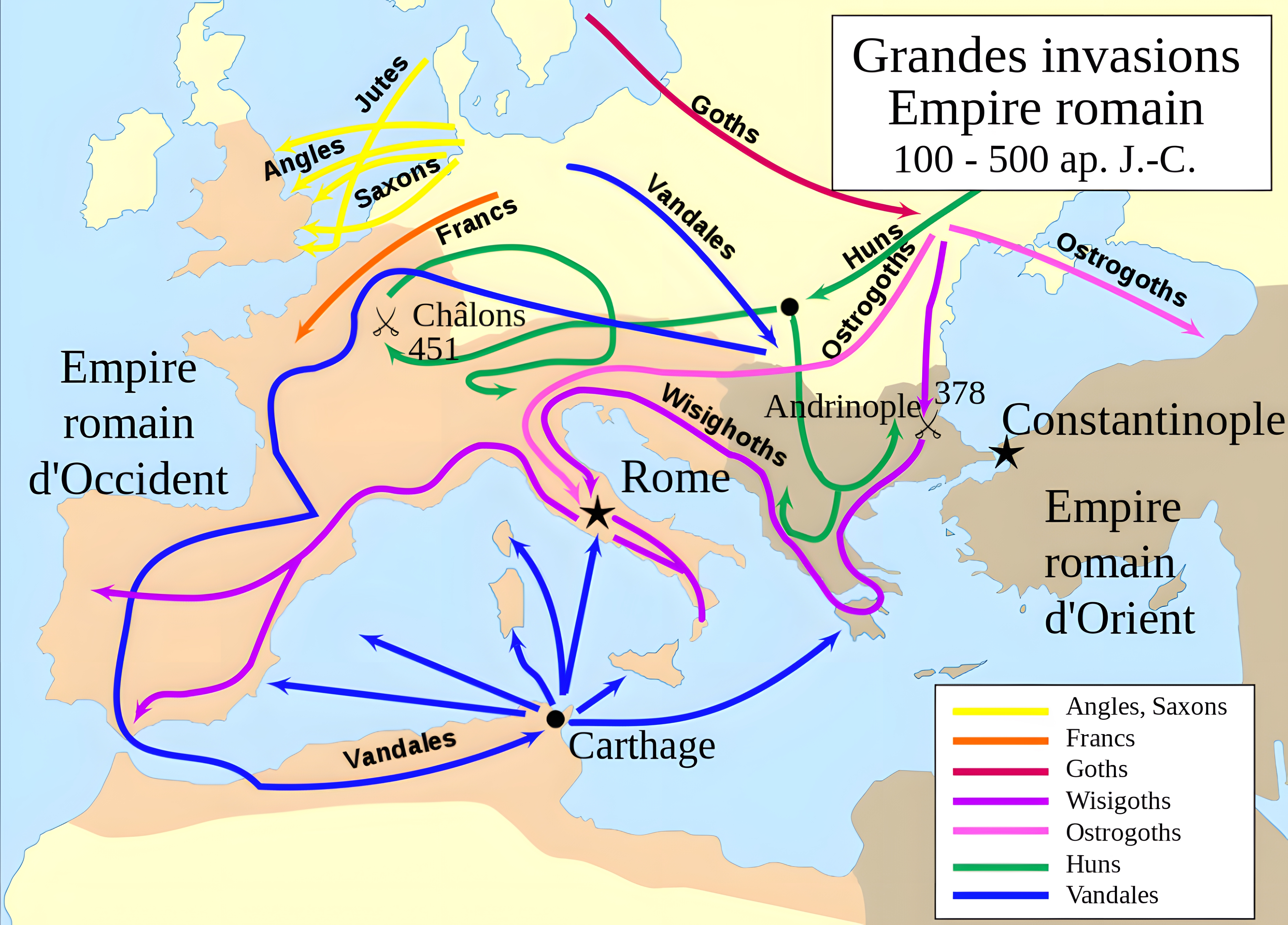 하지만 400년 무렵 동쪽에서 밀려든 훈족 Huns 이 습격하자 많은 게르만 부족이 서쪽으로 로마 제국 영토로 이주하게 되고,