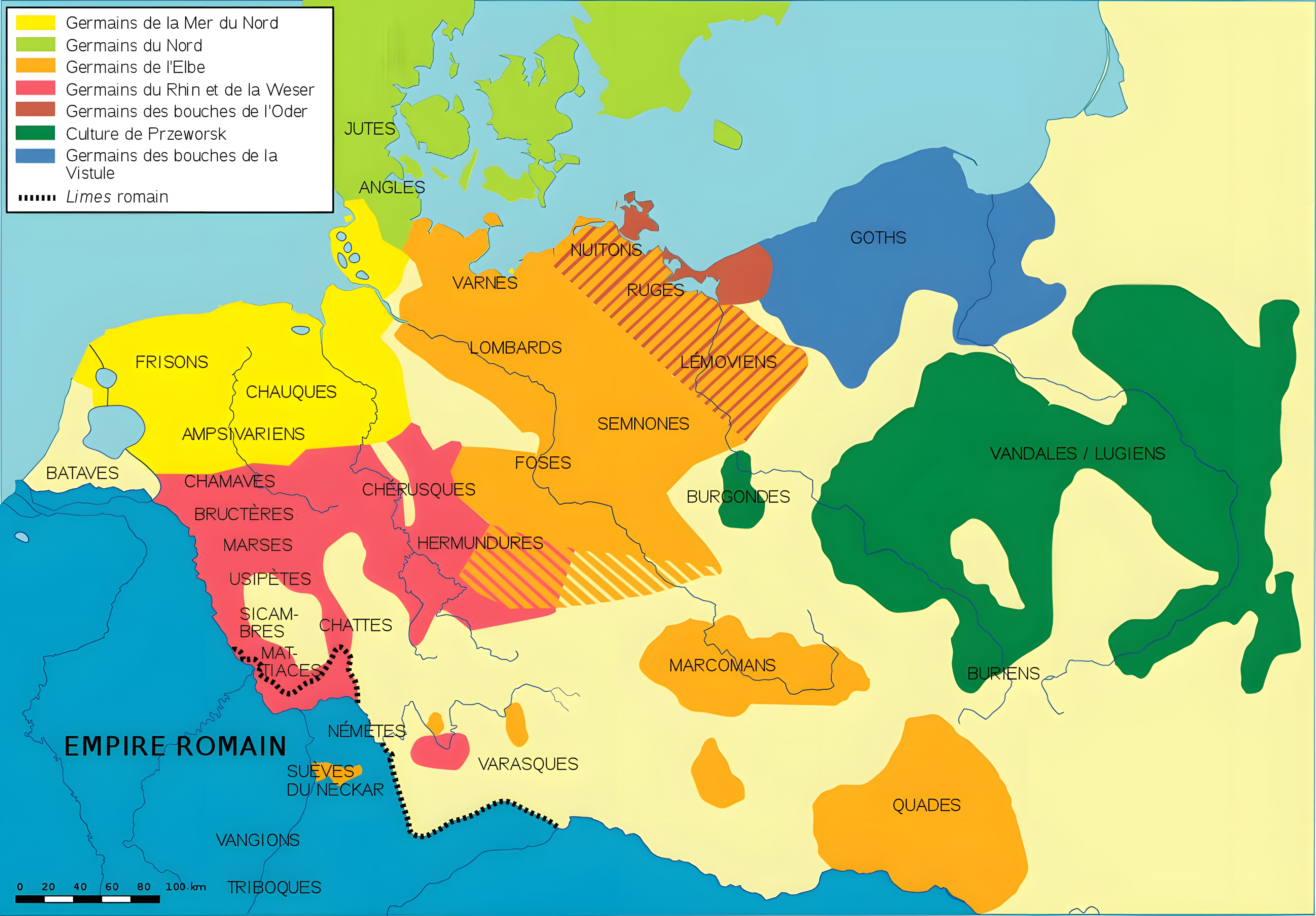 저에서 표시한 저 각종 족속은 그 이전 단계, 그러니깐 타키투스 단계에서는 게르만이라 퉁치던 족속들로, 게르만이라는 이름을 붙였지만, 과연 저들이 한 계통인지는 의심스럽기 짝이 없다.