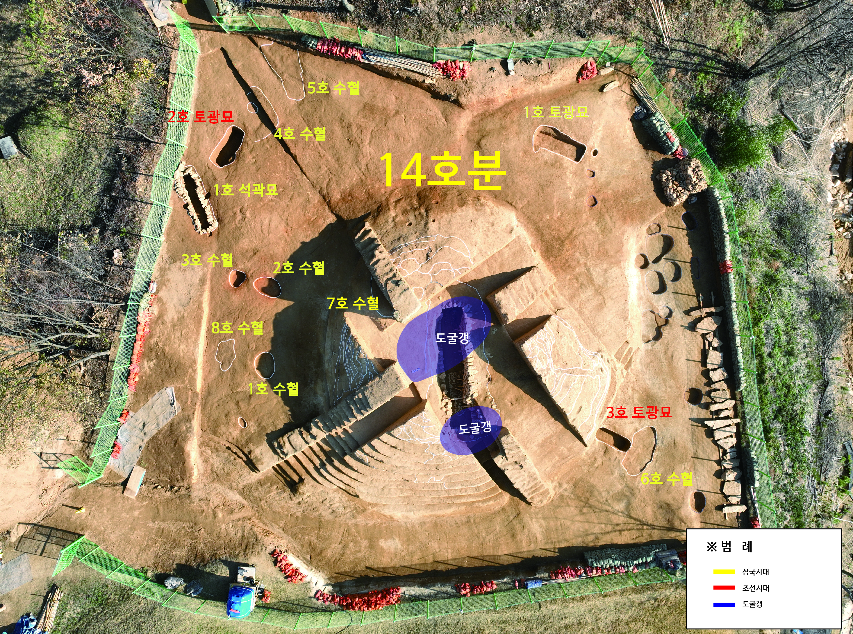 "조사 결과 14호분의 규모는 직경 20m, 높이 4m로 추정되며, 구릉 사면을 ‘L’자형으로 굴착하여 정지층을 조성하고, 매장시설을 안치한 후 봉분을 성토하였다."