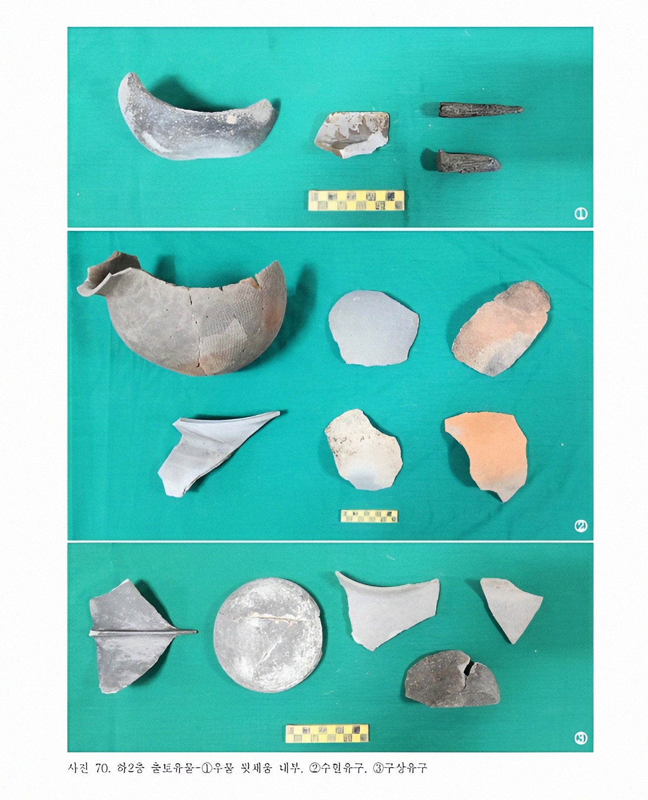 상층과 하층 우물 경계면부터 완형 토기가 노출되기 시작하는데 기종으로는 주로 항아리류가 다수를 차지하는 가운데 속 깊은 바리 모양 기종도 간간이 있다.