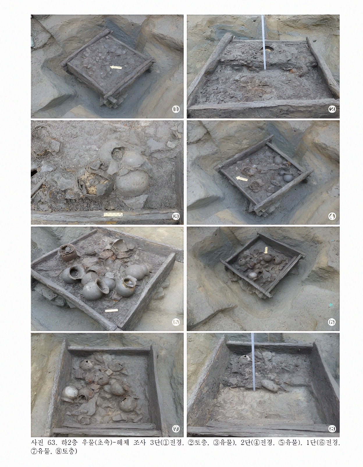 조사성과를 연구원에서는 토층에 따라 지표상에서부터 아래로 내려가며 나름 구분을 했는데, 간단히 상층과 하층으로 구분하고, 하층은 무슨 근거에서인지는 모르겠지만 상층과 하층으로 다시 분기했다.