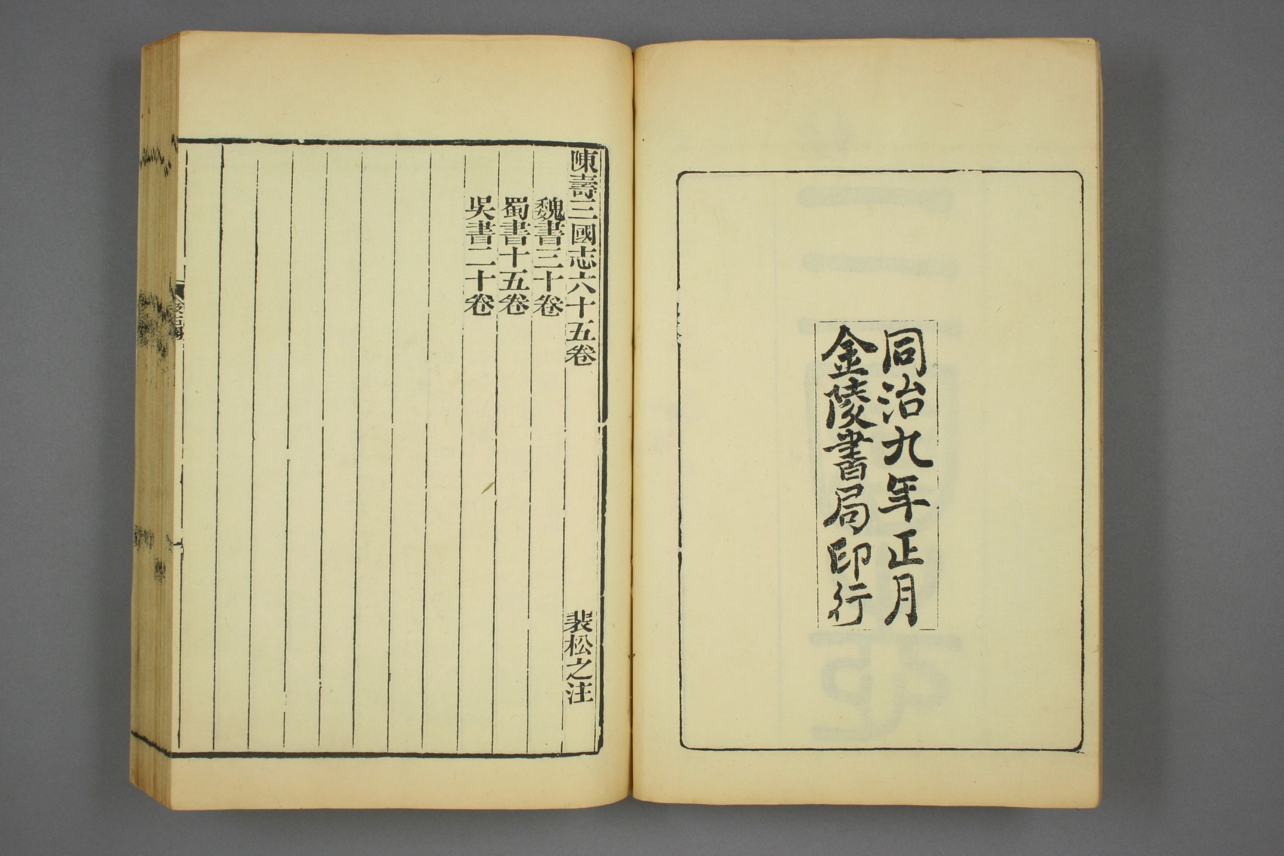 유송劉宋 문제文帝인 유의륭劉義隆이 삼국시대의 異同을 모아 진수陳壽의 《三國志》를 주석하라고 명하여 裴松之가 완성한 해설서이다. 裴松之는 傳紀를 수집해 이문異聞을 널리 모아 완성하고는 헌상했다. 이에 황제는 이를 예람叡覽하고는 “이야말로 불후不朽라고 할 만하다”고 상찬했다.