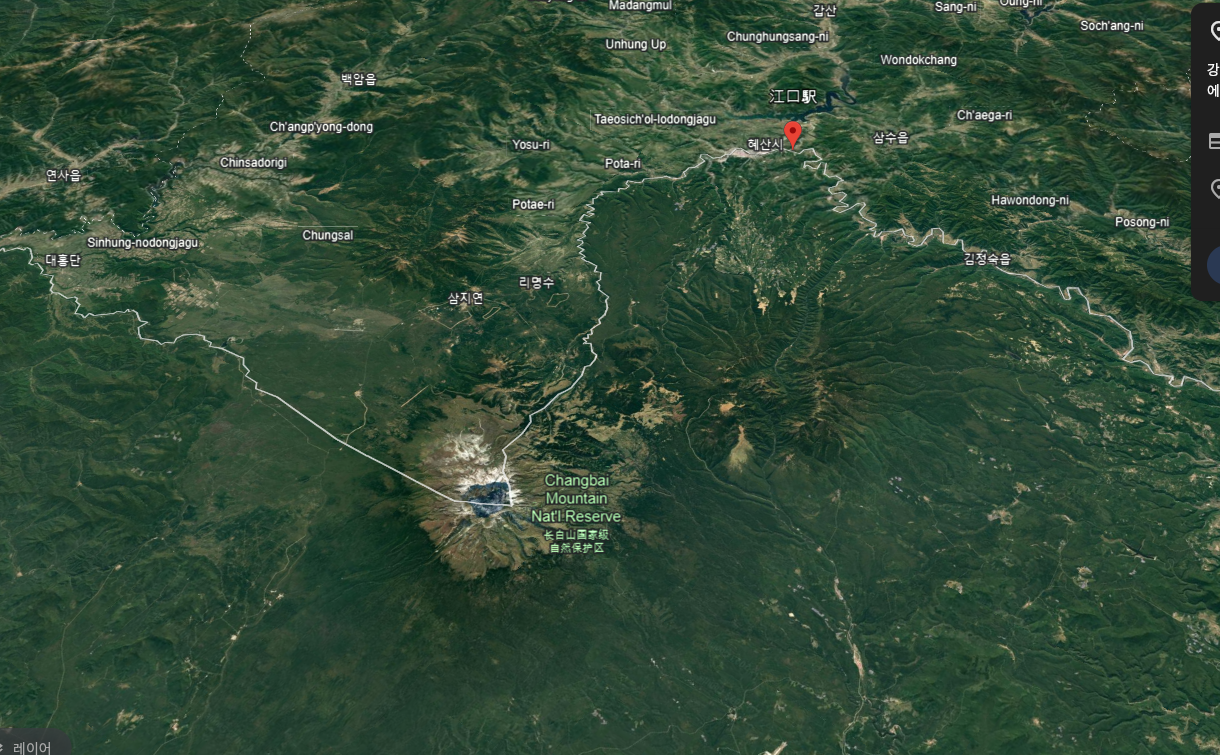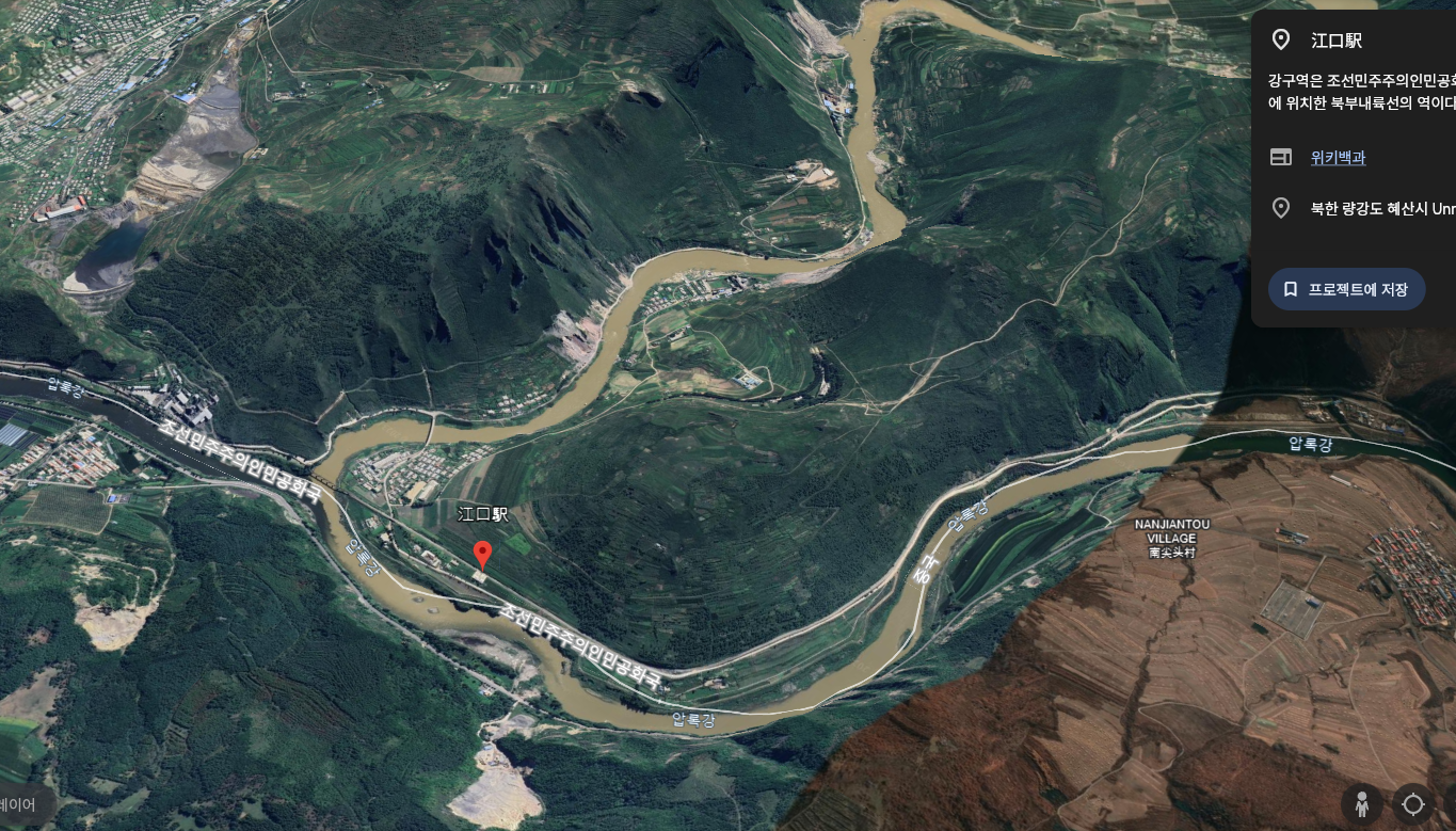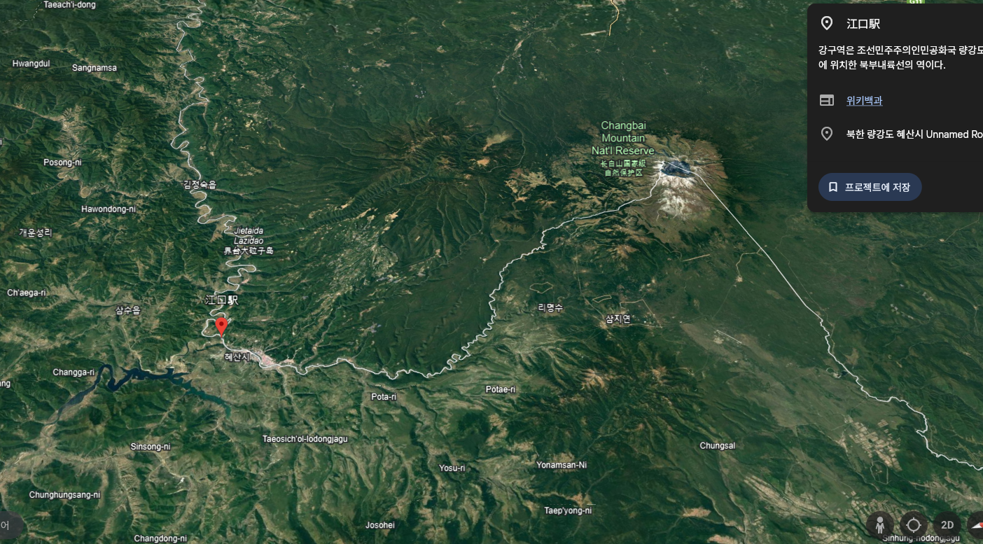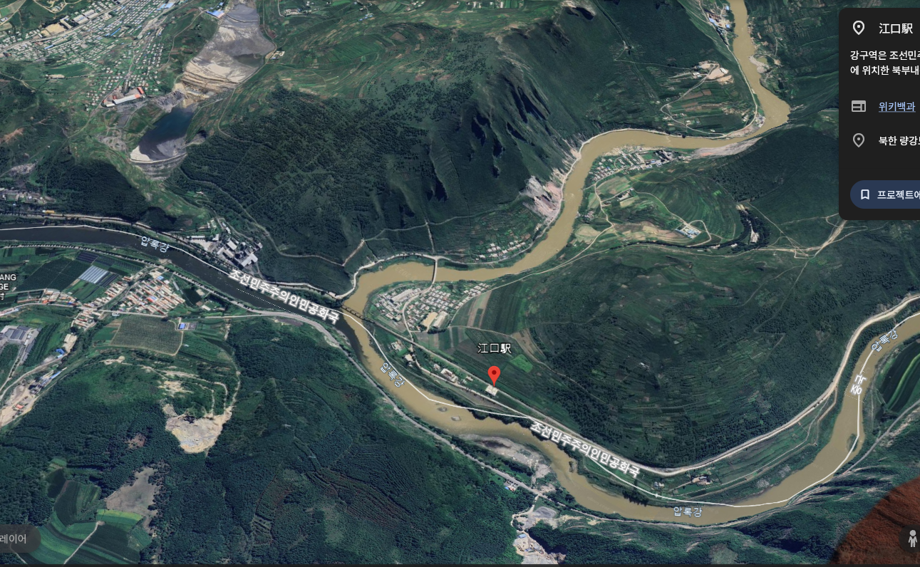 혜산시 강구동이 어느 지점인가를 구글어스를 두들기니, 강구역이라는 역 이름이 확인되어 이 일대가 강구동에 속한다고 보면 아래와 같다.