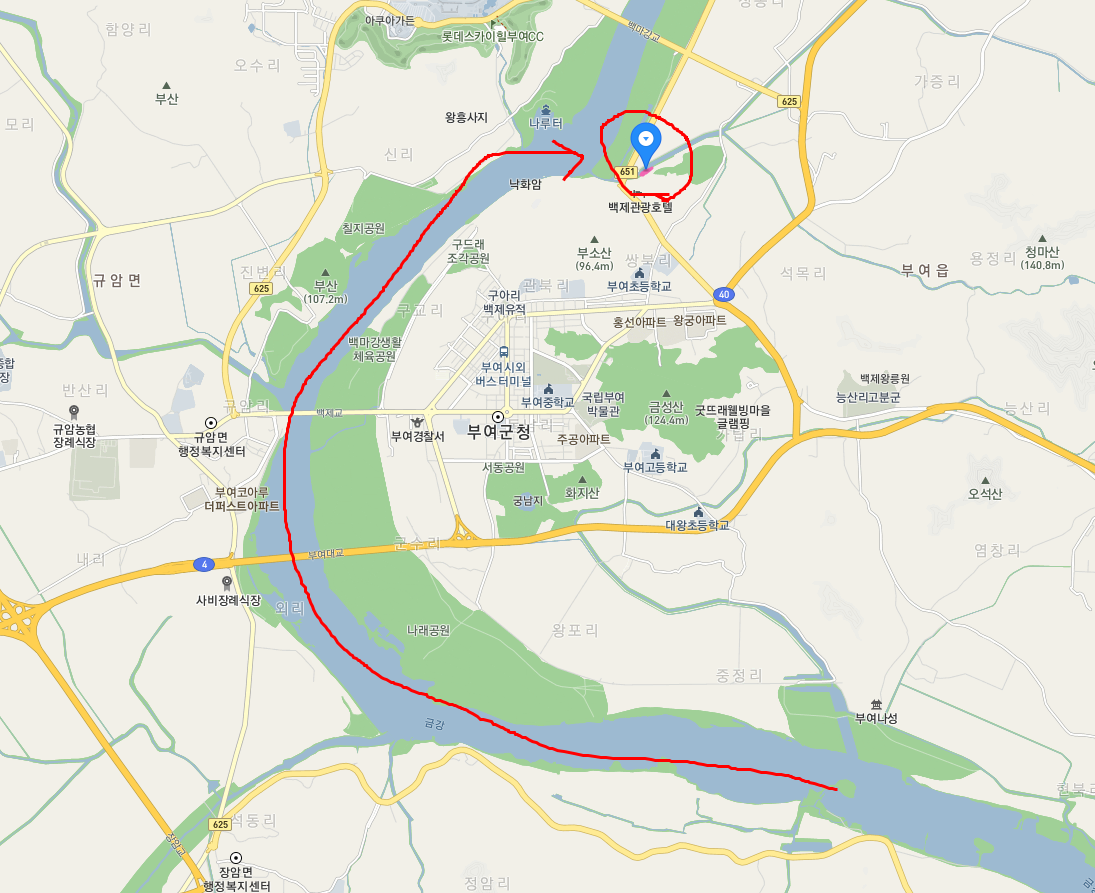 보니 북쪽은 맞다. 부소산 약간 동쪽으로 치우친 지점 금강과 인접하는 지점이다. 저짝에 성문이 있다? 대체 왜?