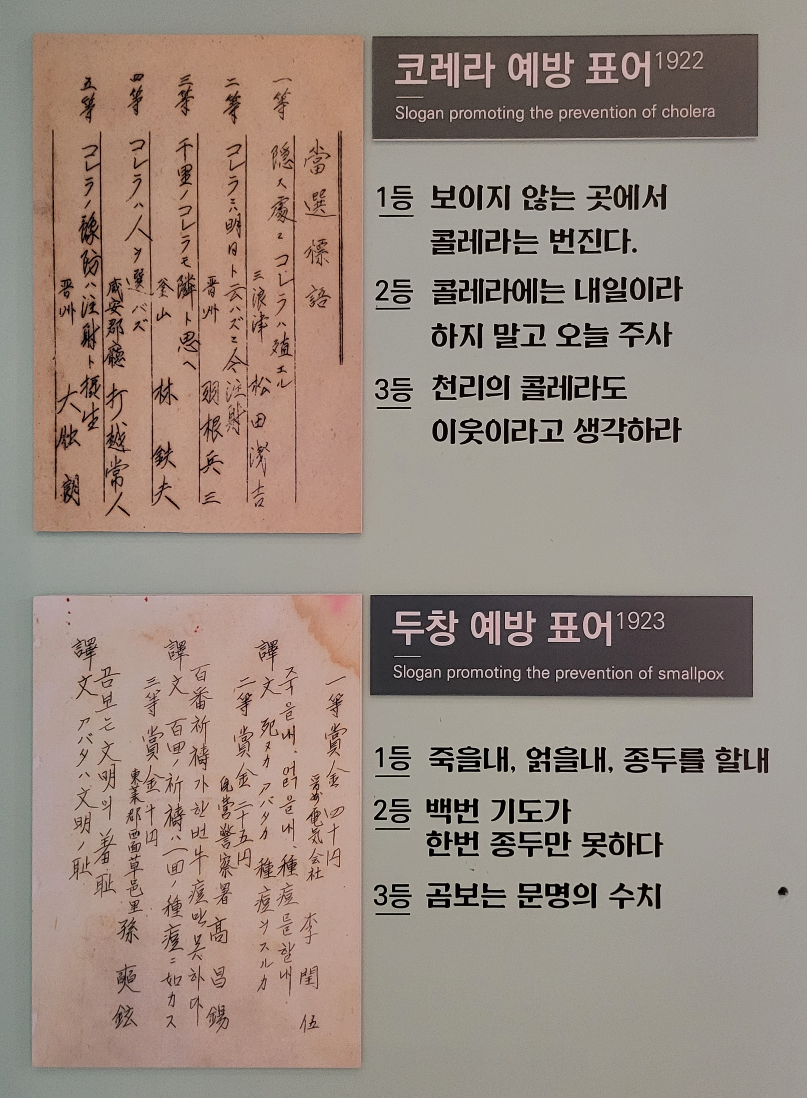 1922년 코레라 예방 표어 당선작과 이듬해 두창 예방 표어 당선작이다.